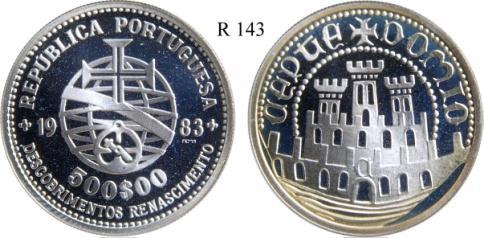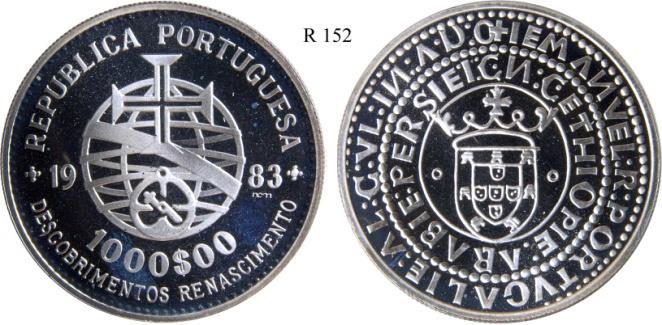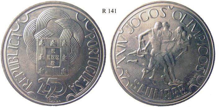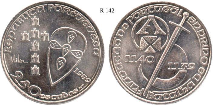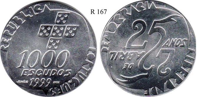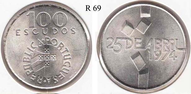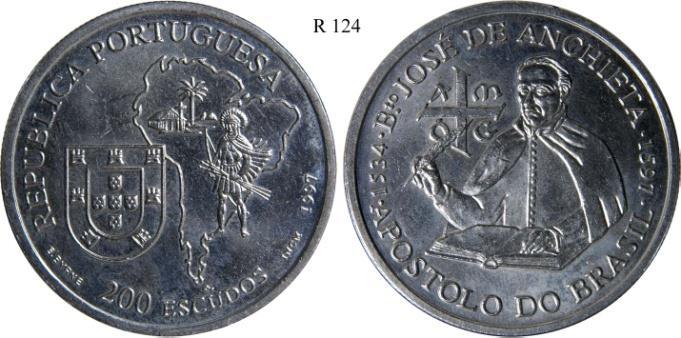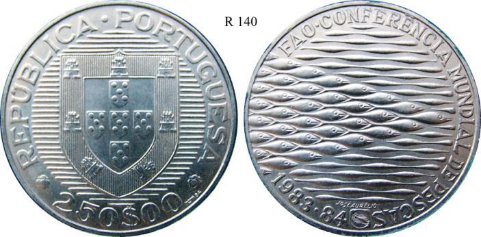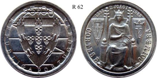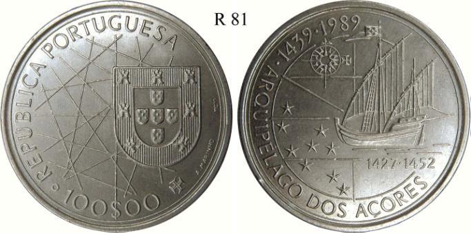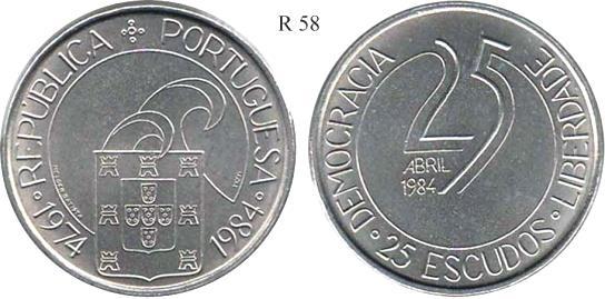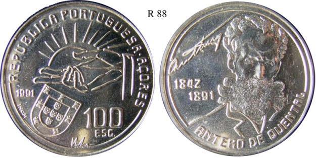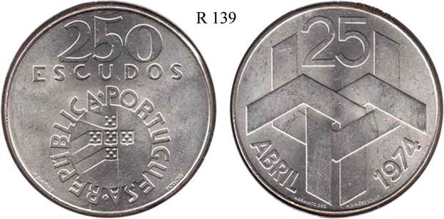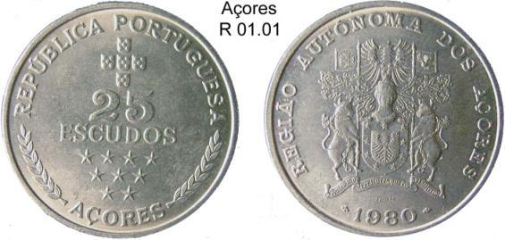 25 DE ABRIL 100 ESCUDOS – Ag 650 Peso: 15 g Ø: 32 S/Data (1977) Sob R 69.01 S/Data (1977) PROOF …………………….. R 69.02 250 ESCUDOS – Ag 650 Peso: 25 g Ø: 37 S/Data (1977) Sob ……………………….. R 139.01 S/Data (1977) PROOF R 139.02 AUTONOMIA DOS AÇORES 25 ESCUDOS – CUPRO-NÍQUEL Peso: 11 g Ø: 28,5 1980 Sob