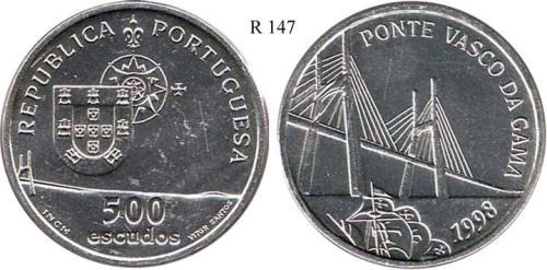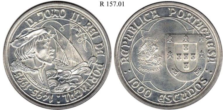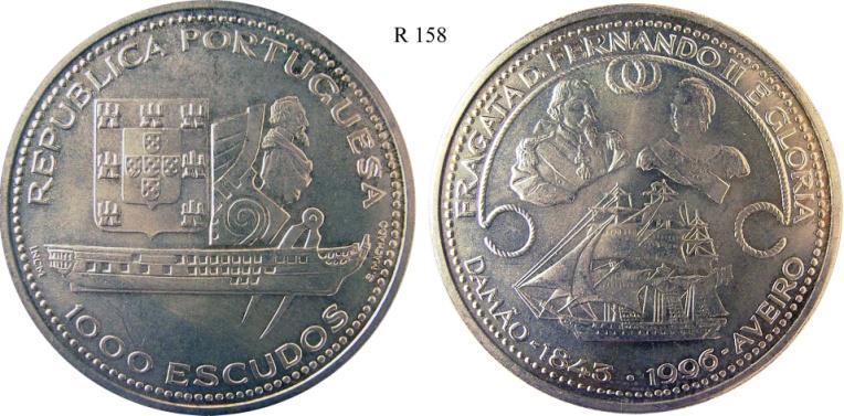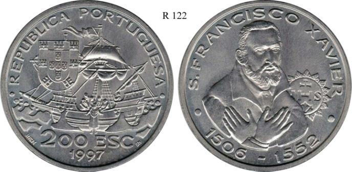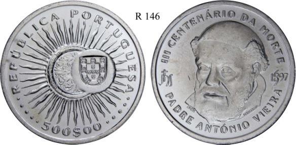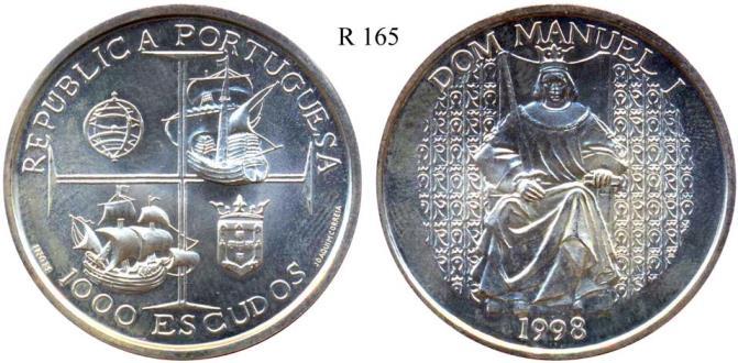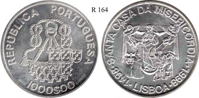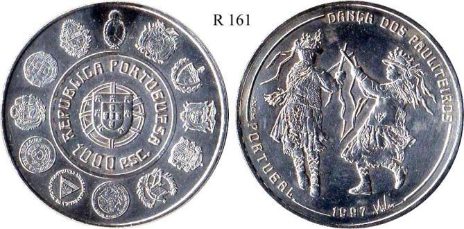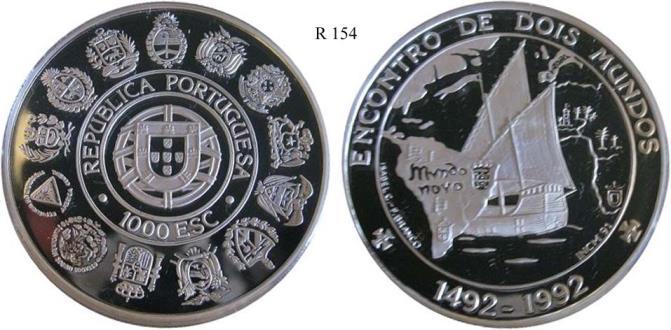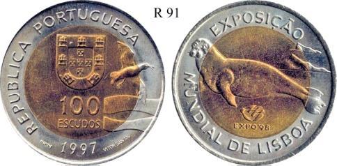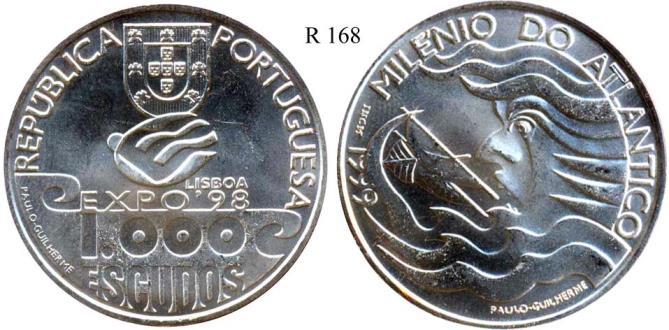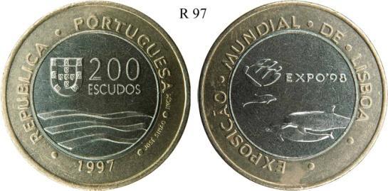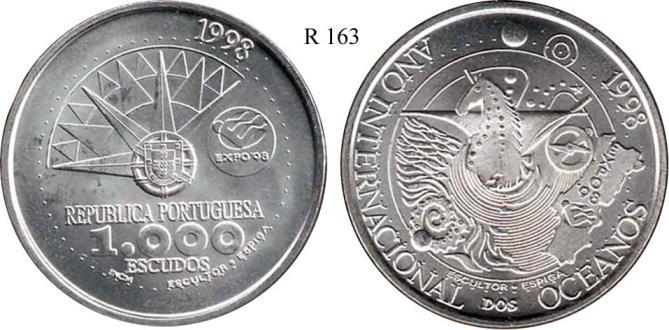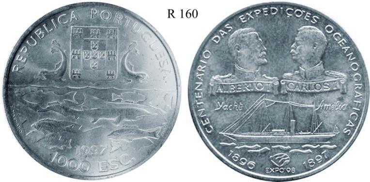 Pag. 85 REPÚBLICA PADRE ANTÓNIO VIEIRA 500$00 – Ag 500 Peso: 14 g Ø: 30 1997……Bela ….…………………………..…. R146.01 DANÇA DOS PAULITEIROS 1 000$00 – Ag 500 Peso: 28,2 g Ø: 40 1997……Sob …..…………………………..…. R161.01 EXPEDIÇÕES OCEANOGRÁFICAS 1.000$00 – Ag 500 Peso: 28,2 g Ø: 40 1997……Sob …..…………………………..…. R160.01 CRÉDITO PÚBLICO 1.000$00 – Ag 500 Peso: 28,2 g Ø: 40 1997……Sob …. R162.01 1998 EXPO-98 100$00 – BI-METÁLICA Peso: 9,8 g Ø: 28 1998……Bela ..…….……………………………... R98.01 1998……PROOF ….……………………………... R98.03 PONTE VASCO DA GAMA 500$00 – Ag 500 Peso: 14 g Ø: 30 1998……Bela ….…………………………..…. R147.01 OCEANOS 1.000$00 – Ag 500 Peso: 28,2 g Ø: 40 1998……Sob ….…………………………..…. R163.0 MISERICÓRDIA DE LISBOA 1.000$00 – Ag 500 Peso: 28,2 g Ø: 40 1998……Sob .….…………………………..…. R164.01