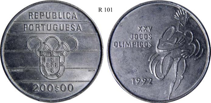 Pag. 82 REPÚBLICA 1988-1989 JOGOS OLÍMPICOS - 1988 250$00 – CUPRO-NÍQUEL Peso: 23 g Ø: 37 1988……Sob ..…….……………………………. R141.01 AUTONOMIA DOS AÇORES 100$00 – CUPRO-NÍQUEL Peso: 15 g Ø: 34 1989……Sob ..…….……………………………. R02.03 Alberto Gomes inclui-a erradamente nos Açores 1990 CAMILO CASTELO BRANCO 100$00 – CUPRO-NÍQUEL Peso: 15 g Ø: 33 1990……Bela …..…….…………………………… R87.01 FUNDAÇÃO DE PORTUGAL 250$00 – CUPRO-NÍQUEL Peso: 23 g Ø: 37 1990……Sob ..…….……………………………. R142.01 1991 ANTERO DE QUENTAL 100$00 – CUPRO-NÍQUEL Peso: 15 g Ø: 33 1991……Sob …..…….…………………………… R88.01 1992 JOGOS OLÍMPICOS - 1992 200$00 – CUPRO-NÍQUEL Peso: 21 g Ø: 36 1992……Bela ..…….……………………………. R101.01 ENCONTRO DE DOIS MUNDOS 1.000$00 – Ag 500 Peso: 27 g Ø: 40 1992……Sob ..….…………………………..…. R154.01