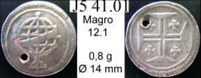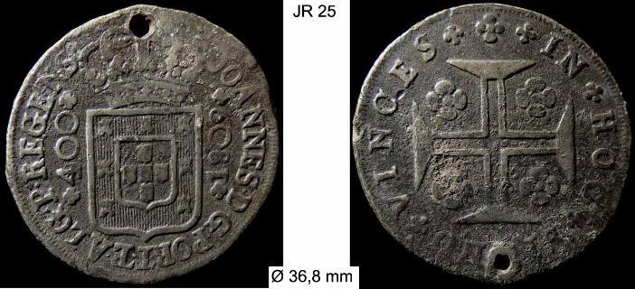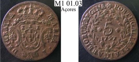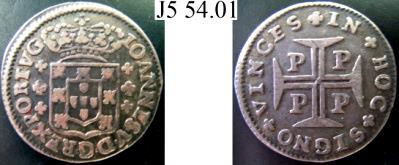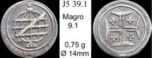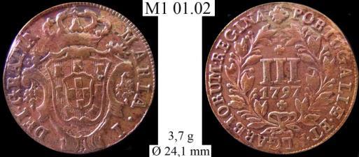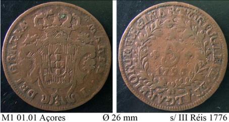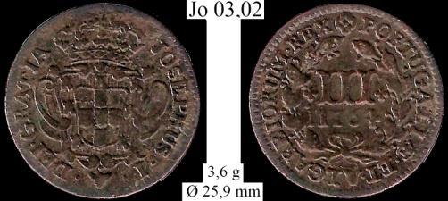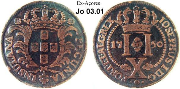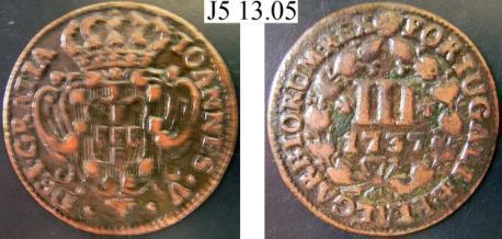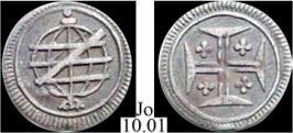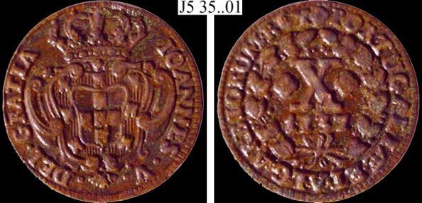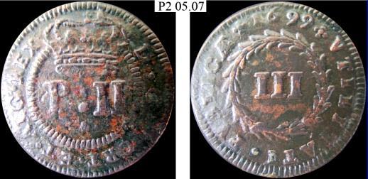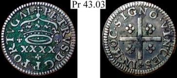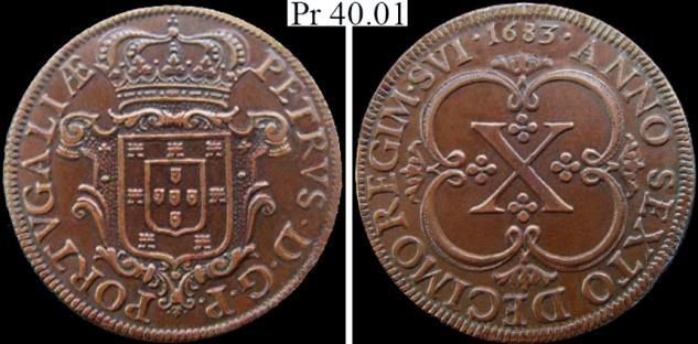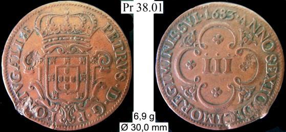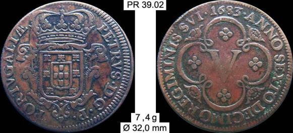 I ½ - REAL E MEIO - COBRE Peso: 3,4 g Ø: 25 1683 ............................................................…….. Pr 37.01 III - TRÊS REAIS - COBRE Peso: 6,9 g Ø: 30 1683 Pr 38.01 V - CINCO REAIS - COBRE Peso: 7,4 g Ø: 32 1683 Pr 39.02 X - DEZ REAIS - COBRE Peso: 22,9 g Ø: 36 1683 ............................................................…….. Pr 40.01