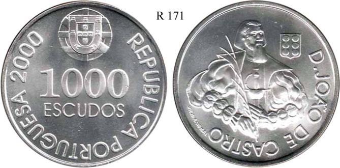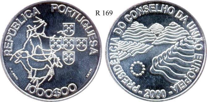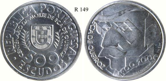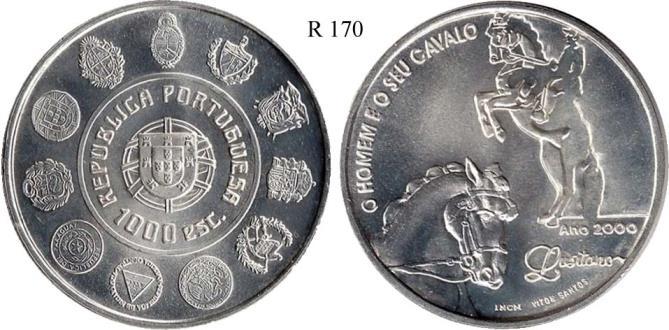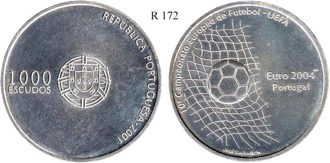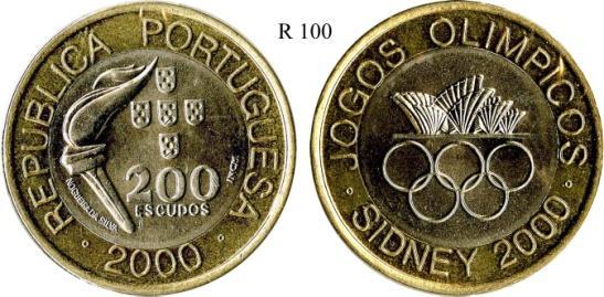 Pag. 87 REPÚBLICA 2000 JOGOS OLÍMPICOS - 2000 200$00 – BI-METÁLICA Peso: 9,8 g Ø: 28 2000……Sob ..…….…………………………… R100.02 PRESIDÊNCIA DA UNIÃO EUROPEIA 1.000$00 – Ag 500 Peso: 28,2 g Ø: 40 2000……Sob .….…………………………..…… R169.01 EÇA DE QUEIROZ 500$00 – Ag 500 Peso: 14 g Ø: 30 2000……Bela ….…………………………..…. R149.01 CAVALO LUSITANO 1.000$00 – Ag 500 Peso: 28,2 g Ø: 40 2000……Sob .….…………………………..… R170.01 2001 PORTO 2001 500$00 – Ag 500 Peso: 14 g Ø: 30 2001……Bela ….…………………………..…. R150.01 D. JOÃO DE CASTRO 1.000$00 – Ag 500 Peso: 28,2 g Ø: 40 2001……Sob .…………………………..… R171.01 FUTEBOL EURO 2004 1.000$00 – Ag 500 Peso: 28,2 g Ø: 40 2001……Sob .…………………………..… R172.01