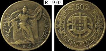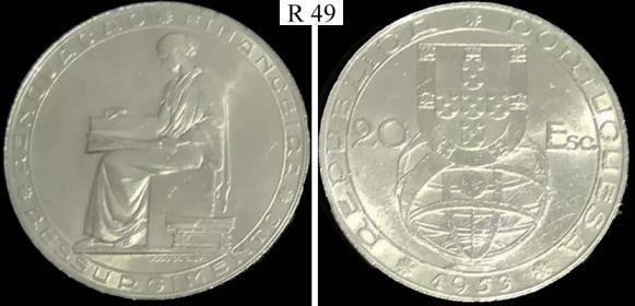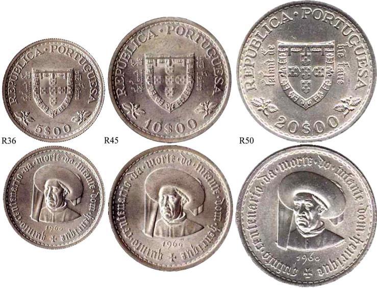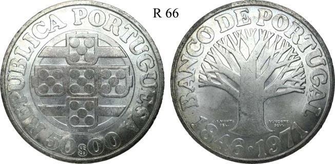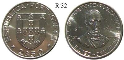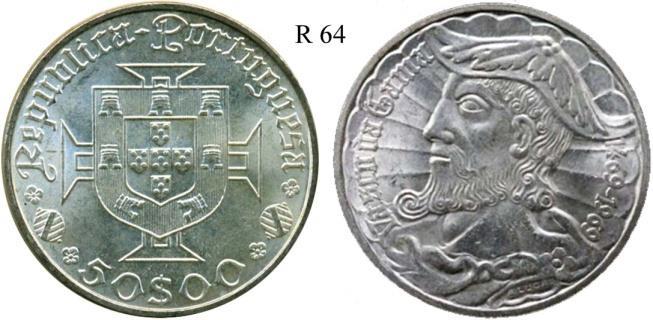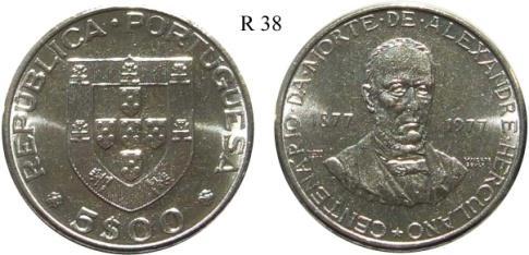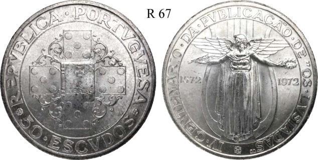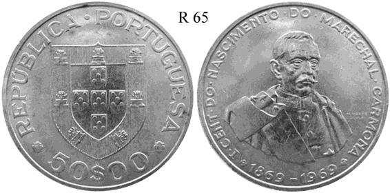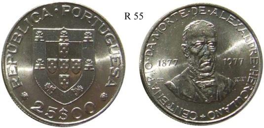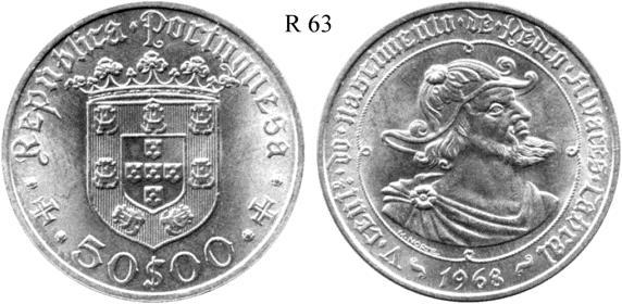 Pag. 75 REPÚBLICA COMEMORATIVAS (1969-1980) ALEXANDE HERCULANO 2$50 – CUPRO-NÍQUEL Peso: 3,5 g Ø: 20 S/Data (1977) Sob ……………………………… R 32.01 S/Data (1977) PROOF R 32.02 5$00 – CUPRO-NÍQUEL Peso: 7,0 g Ø: 24,5 S/Data (1977) Sob ……………………………… R 38.01 S/Data (1977) PROOF …….…………………… R 38.02 25$00 – CUPRO-NÍQUEL Peso: 9,5 g Ø: 26 S/Data (1977) Sob ……………………………… R 55.01 S/Data (1977) PROOF … R 55.02 PEDRO ÁLVARES CABRAL 50$00 – Ag 650 Peso: 18 g Ø: 34 1968 Sob ……………………………………….. R 63.01 VASCO DA GAMA 50$00 -– Ag 650 Peso: 18 g Ø: 34 1969 Sob ……………………………………….. R 64.01 MARECHAL CARMONA 50$00 Ag 650Peso: 18 g Ø: 34 1969 Sob ……………………………………….. R 65.01 BANCO DE PORTUGAL 50$00 - Ag 650 Peso: 18 g Ø: 34 1971 Sob ……………………………………….. R 66.01 LUSÍADAS 50 ESCUDOS – Ag 650 Peso: 18 g Ø: 34 1972 Sob ……………………………………….. R 67.01