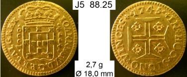 Pag. 18 IOANNES . V . D. G . PORT . ET . ALG . REX MEIO DOBRÃO – 12.000 RÉIS Minas Gerais Peso: 26.9 g Ø: 33 1724 / 27 J5 105 DOBRÃO – 24.000 RÉIS Minas Gerais Peso: 53.6 g Ø: 37.8 1725 J5 106.02 OURO – SÉRIE BUSTO / BRAZÃO CRUZADINHO – 400 RÉIS Rio de Janeiro e Minas Gerais Peso: 0.9 g Ø: 13.7 1734 –Minas ……………………..……………. J5 108.04 MEIO ESCUDO – 800 RÉIS Lisboa, Bahia, Rio e Minas Peso: 1.8 g Ø: 17.2 1722 –Lisboa …………………..……… J5 108.04 ESCUDO – 1.600 RÉIS Lisboa, Bahia, Rio e Minas Peso: 3.5 g Ø: 20.3 1742 –Lisboa …….….…………..…………….. J5 117.17 MEIA PEÇA – 3.200 RÉIS Lisboa, Bahia, Rio e Minas Peso: 7.1 g Ø: 25.9 1738 –Lisboa ……………………..……… J5 122.12 PEÇA – 6.400 RÉIS Lisboa, Bahia, Rio e Minas Peso: 14.1 g Ø: 31.0 1749 –Lisboa ……………………..……… J5 132.32 DOBRA – 12.800 RÉIS Lisboa, Bahia, Rio e Minas Peso: 28.5 g Ø: 37.3 1749 –Minas ………………………..……………. J5 140.10