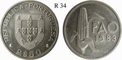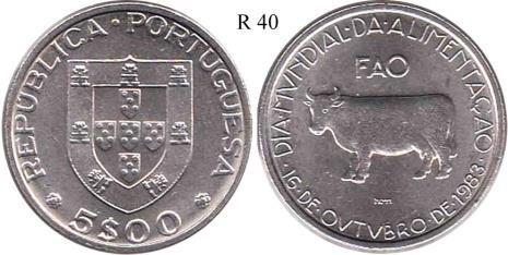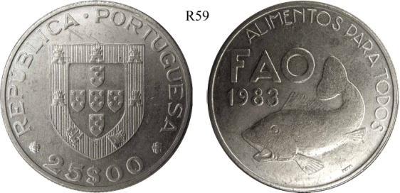 Pag. 79 REPÚBLICA 5$00 - CUPRO-NÍQUEL Peso: 7,0 g Ø: 24,5 S/Data (1983) …Sob ……………………………….. R39.01 S/Data (1983) …BNC ...……………………………. R39.02 25$00 - CUPRO-NÍQUEL Peso: 9,5 g Ø: 28,5 S/Data (1983) …Sob ……………………………….. R56.01 S/Data (1983) …BNC ...……………………………. R56.02 1983 - FAO – ALIMENTAÇÃO PARA TODOS 2$50 - CUPRO-NÍQUEL Peso: 3.5 g Ø: 20 1983……Sob …………………..……………………..R34.01 5$00 - CUPRO-NÍQUEL Peso: 7,0 g Ø: 24,5 1983……Sob …………………..……………………..R40.01 25$00 - CUPRO-NÍQUEL Peso: 9,5 g Ø: 28,5 1983……Sob …………………..……………………..R59.01 1983 XVII EXPOSIÇÃO EUROPEIA DE ARTE 500 ESCUDOS – Ag 835 Peso: 7,0 g Ø: 25 1983 PROOF R143.03 750 ESCUDOS – Ag 835 Peso: 12,5 g Ø: 30 1983 PROOF R151.03