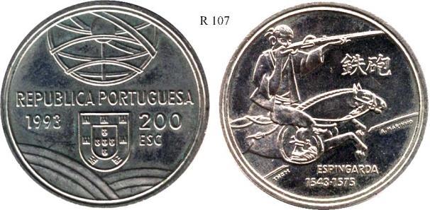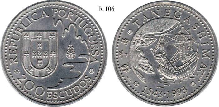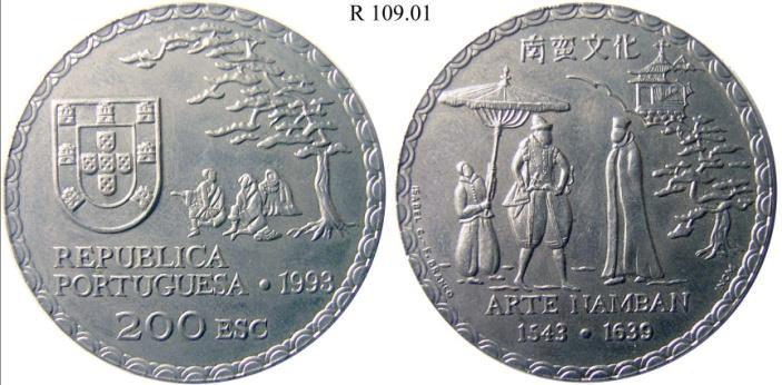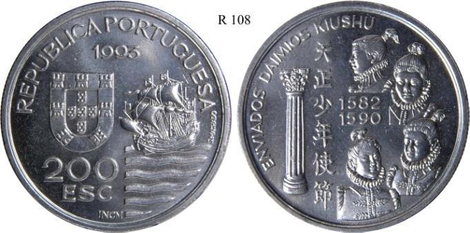 Pag. 89 REPÚBLICA III SÉRIE 200$00 – CUPRO-NÍQUEL Peso: 21.0 g Ø: 36 mm NAVEGAÇÃO PARA OCIDENTE 1991……Sob .…………………………..… R 102.01 IV SÉRIE 200$00 – CUPRO-NÍQUEL Peso: 21.0 g Ø: 36 mm CHEGADA AO JAPÃO-TANEGASHIMA 1993……Sob .…………………………..… R 106.01 COLOMBO E PORTUGAL 1991……Sob .…………………………..… R 103.01 ESPINGARDA 1993……Sob .… R 107.01 DESCOBERTA DA AMÉRICA S/Data (1992)……Sob ………………..… R 104.01 DAIMIOS KIUSHU 1993……Sob …………………………..…… R 108.01 JOÃO RODRIGUES CABRILHO S/Data (1992)……Sob ………………..…… R 105.01 ARTE NAMBAN 1993……Sob …………………………..…… R 109.01