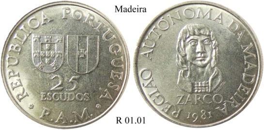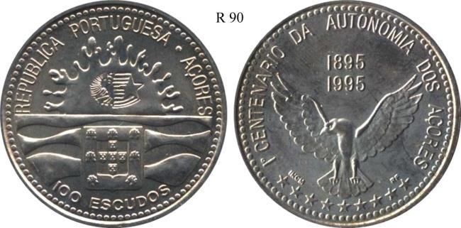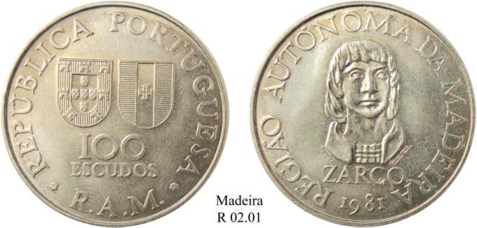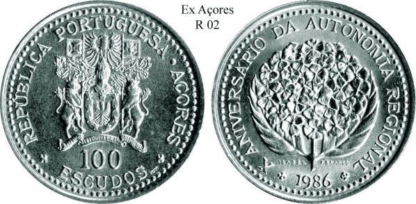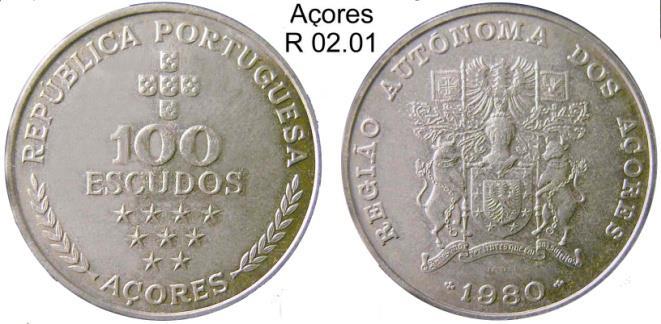 01.01 100 ESCUDOS – CUPRO-NÍQUEL Peso: 15 g Ø: 34 1980 Bela R 02.01 O catálogo Alberto Gomes considera, erradamente, as séries AUTONOMIA DOS AÇORES e AUTONOMIA DA MADEIRA como moedas emitidas para essas regiões. Desde D. Carlos I (1901) que não há moedas para as regiões autónomas.