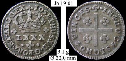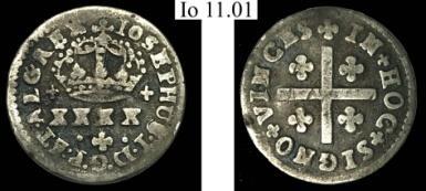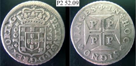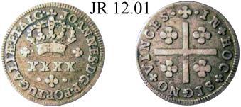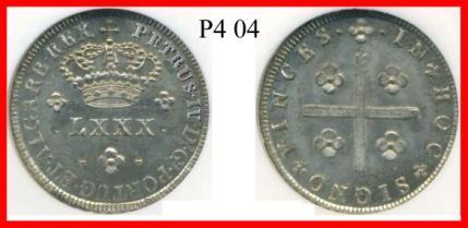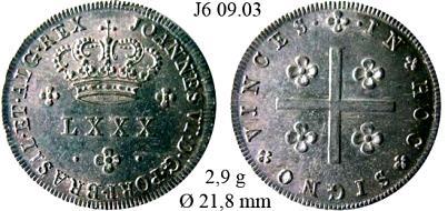 Prata Dois Vinténs (Meio Tostão) XXXX 40 (50) Meio Tostão (Três Vinténs) - 50 (60) Quatro Vinténs (Tostão) LXXX 80 (100) Tostão (Seis Vinténs) - 100 (120)
