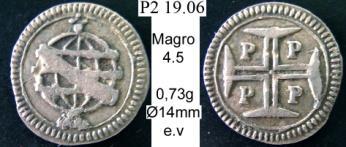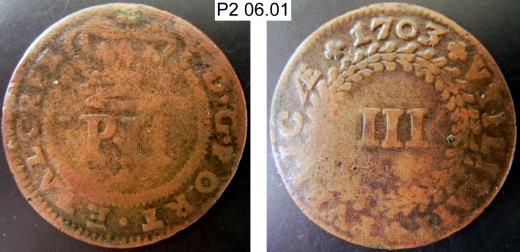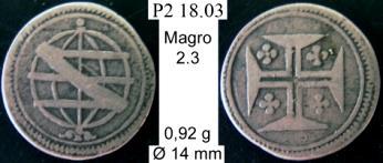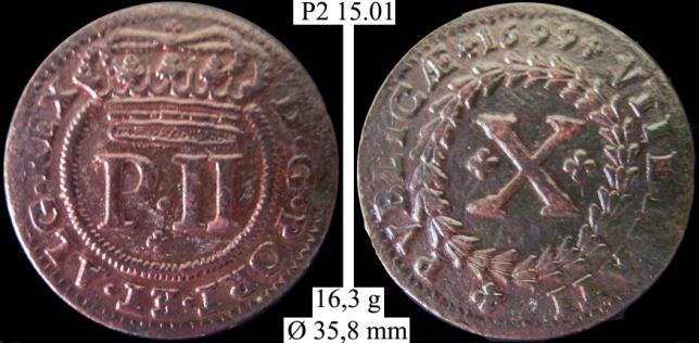Pag. 8 PETRVS . II . D. G . PORTVG . ET . ALG . REX I ½ - REAL E MEIO - COBRE Peso: 2,3 g Ø: 22 1699 …………………………………………….. P2 01.01 Peso: 2,3 g Ø: 22 1699 …………….………………………………….2 02.01 Peso: 2,3 g Ø: 22 1703 P2 03.01 III - TRÊS RÉIS - COBRE Peso: 4,6 g Ø: 26 1699 P2 05.07 Peso: 4,6 g Ø: 26 1703 …………….……………………………….. P2 06.01 V - CINCO RÉIS Peso: 8,0 g Ø: 31 1699 P2 13.01 X - DEZ RÉIS - COBRE Peso: 16,7 g Ø: 36 1699 P2 15.01 Peso: 16,7 g Ø: 36 1703 P2 17.06