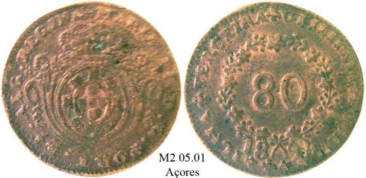 MEIO TOSTÃO – 50 Réis CORÔA DE PRÍNCIPE Peso: 2,2 g Ø: 19 S/data P2 21.01 LXXX –
