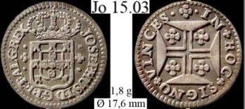 Pag. 14 IOANNES . V . D. G . PORT . ET . ALG . REX CASA DA MOEDA DE LISBOA SÉRIE JV I ½ RÉIS – COBRE Peso: 1.8 g Ø: 22 1712 J5 05.01 III RÉIS – COBRE Peso: 3.2 g Ø: 27.3 1714 …………………………………...………….. J5 11.01 Peso: g Ø: 1720 J5 11.06 V RÉIS – COBRE Peso: 5.3 g Ø: 31.5 1713 …………………………………...……………J5 14.05 Peso: g Ø: 1717 J5 14.09 X RÉIS – COBRE Peso:11.4 g Ø: 37.3 1713 J5 22.03 Peso: g Ø: 1713 J5 29.01 SÉRIE MÓDULO GRANDE III RÉIS – COBRE Peso: 3.0 g Ø: 27.5 1733 J5 12.06 V RÉIS – COBRE Peso: g Ø: 29 1723 J5 18.01