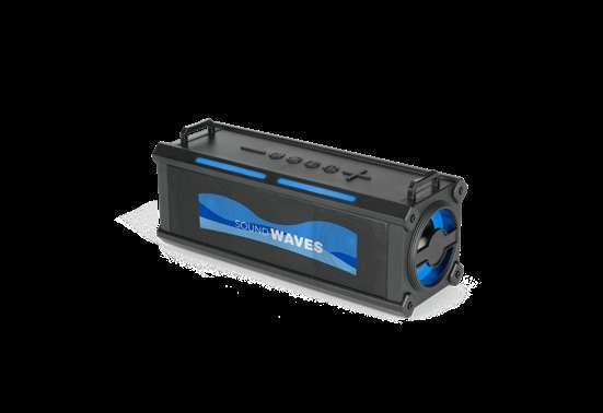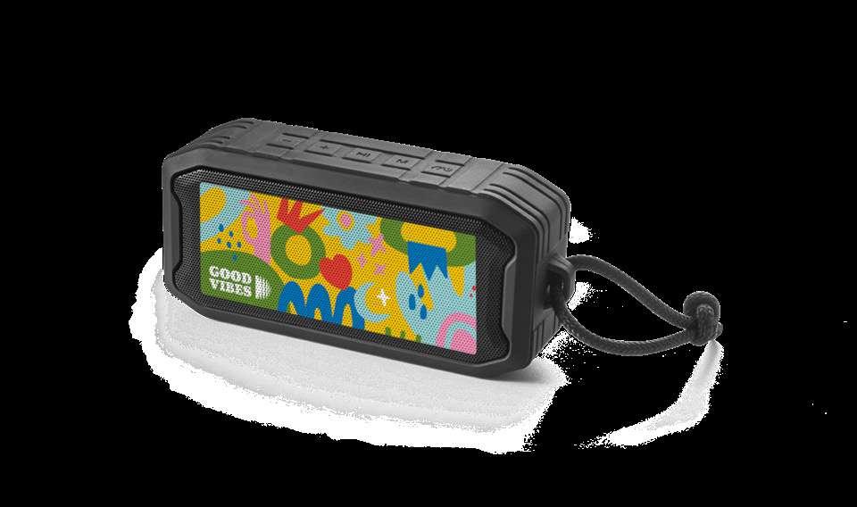 Portable speaker made from recycled ABS (100% rABS), waterproof to IPX7, making it the ideal solution for outdoor use. With BT v5.0 wireless transmission, it has a micro SD card reader, USB-A input and 3.5mm auxiliary input. With 10W of sound power and a battery capacity of 1,200 mAh, it has an autonomy of approximately 9 hours. Thanks to the built-in microphone, you can answer calls and control the volume and playlist of your mobile device. The grille can be fully customised. Includes a USB-C charging cable. Supplied in a kraft paper gift box.