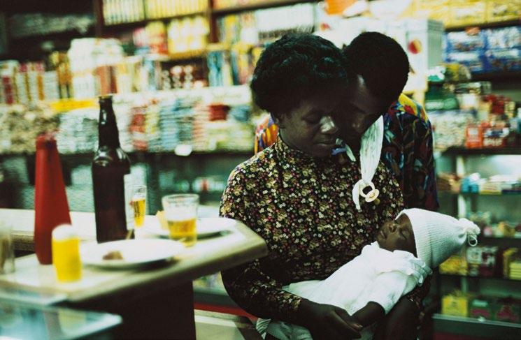 com o bebê e desfoca o fundo, que, no entanto, se conecta ao primeiro plano, por meio da repetição de cores, em especial o amarelo e o vermelho.