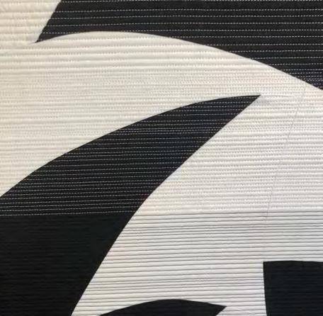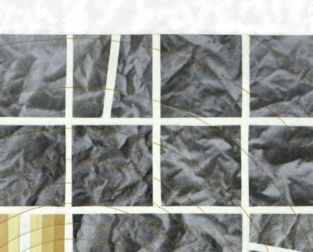 BLACK AND WHITE REPRESENT the boldest of all contrasts and can evoke powerful emotions. When juxtaposed, intensity and clarity emerge. This figure-ground study was started by combining several mirrored compositions from freehand cut black and white elements. The juxtaposition and the dilution of foreground and background creates visual interest, tension and depth, while the curved lines and pointed corners create movement. Using contrasting thread in each half of the quilt further shifts the focus between dark and light, and the gradually narrowing and widening of the quilting lines creates the illusion of depth.