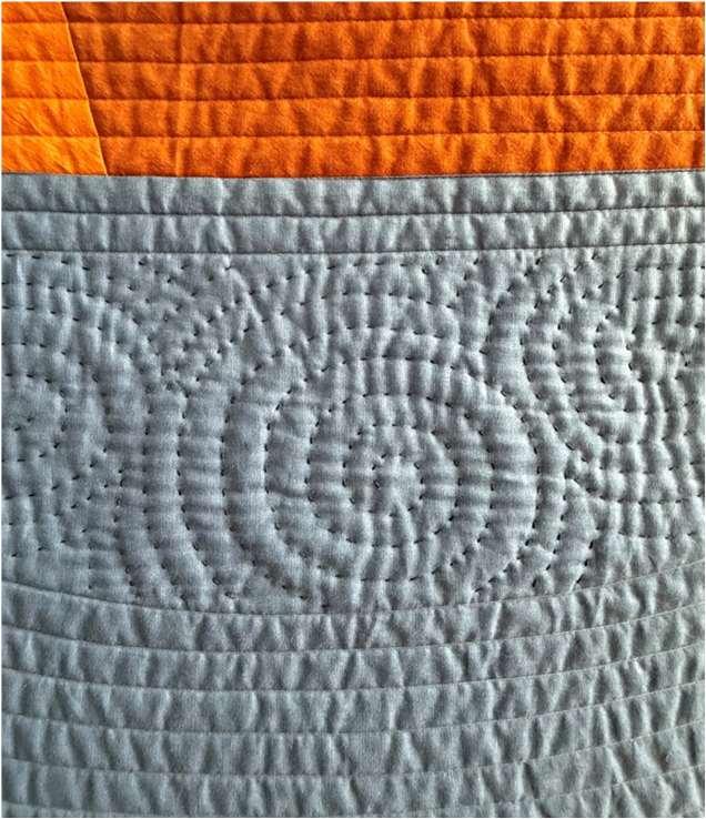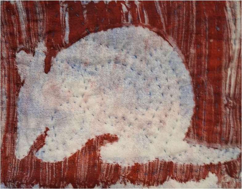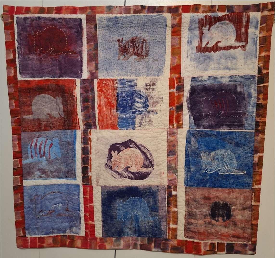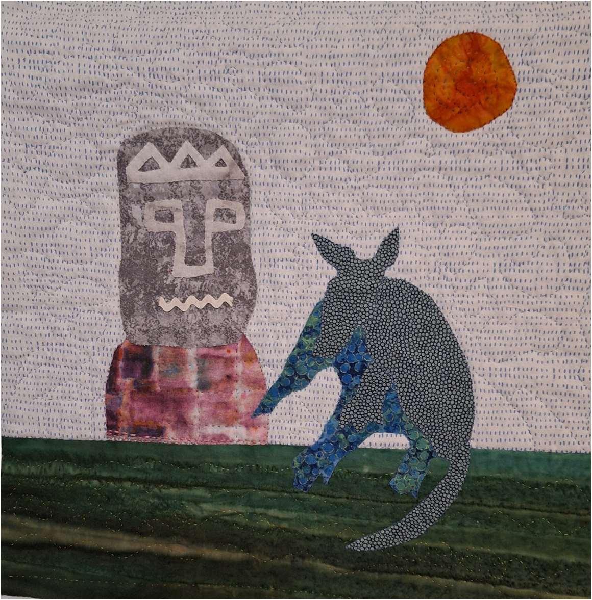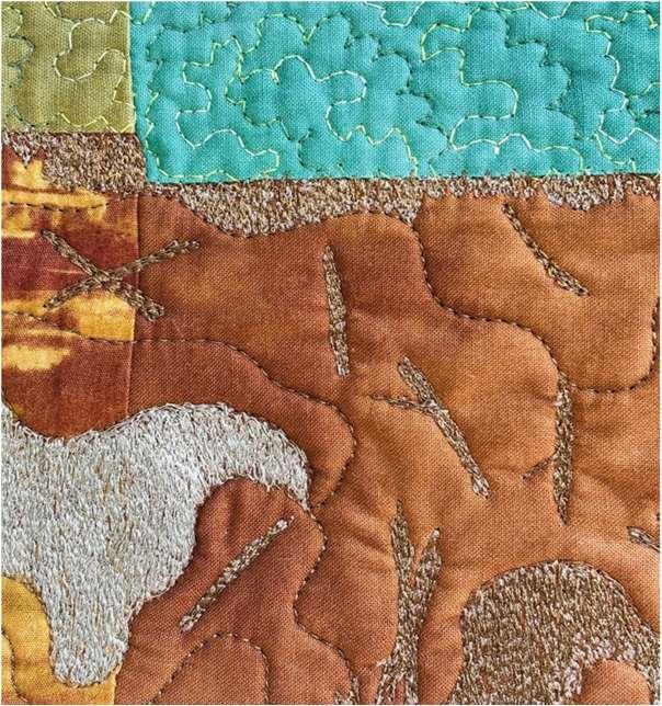 Armadillosaremyprimarymotif,reflectingmy backgroundandtravels.Inspiredbyapainted rockIphotographedinBoliviain2000,this pieceevokesnostalgic,dreamlikememoriesof yearsexploringLatinAmericaandthe Caribbean,echoedinthesubtlequilting.