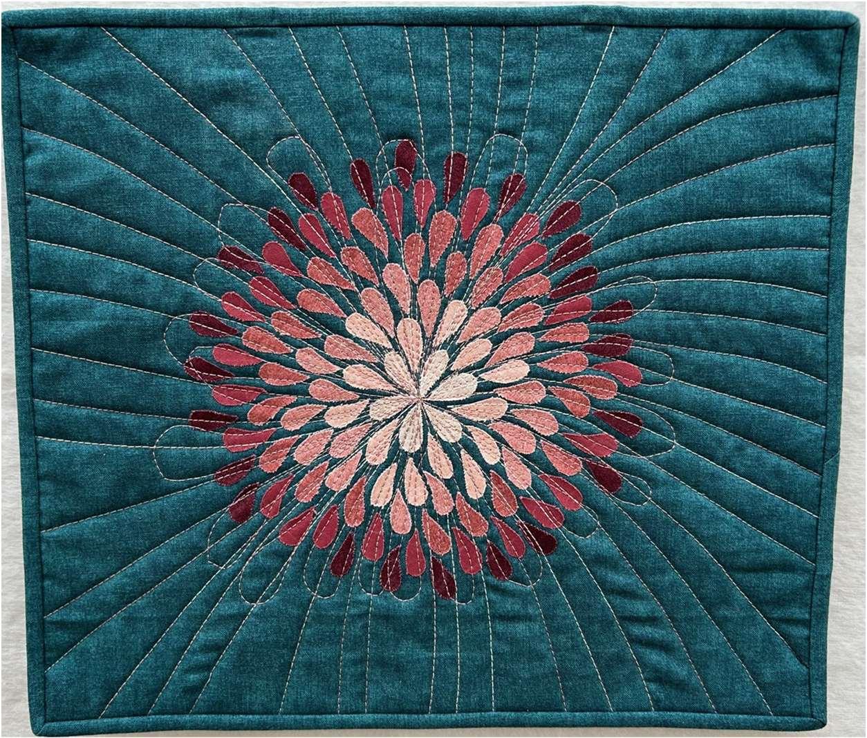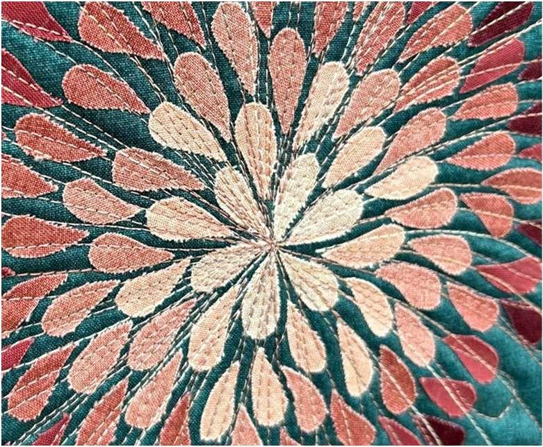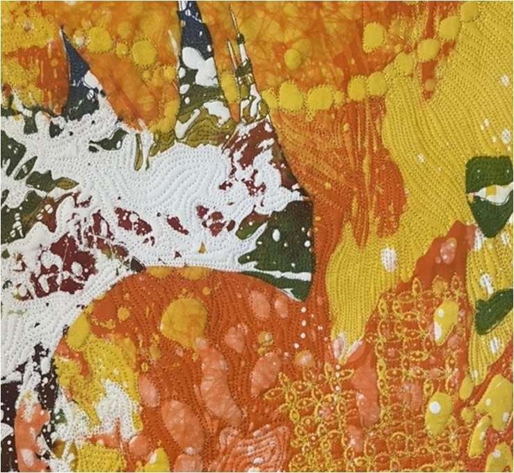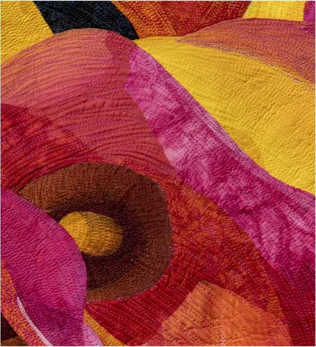 Naturedeeplyinspiresme.Whenmyfirst dahliabloomed,itsunfoldingpetals burstingwithcolormovedmetorecreateit infabric.Throughraw-edgeappliquéand improvisationalquilting,Istitchedmylove forcolorandmygarden.