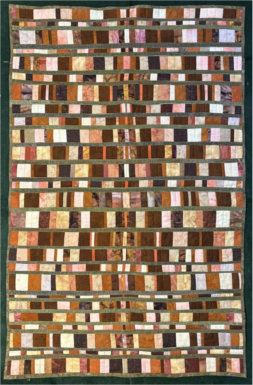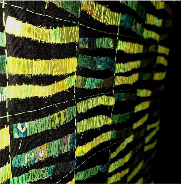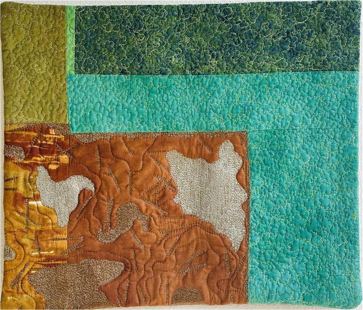 ThisquiltreflectsAmazoniandeforestationin Ecuador.Lushgreensevokerainforestvitality, whileburntorangeandbrowndepictclearedland, losthabitats,anddisplacedspecies.De-Forest invitesreflectiononecologicalfragilityand environmentalconsequences. Improvpiecing,freemotionquilting.