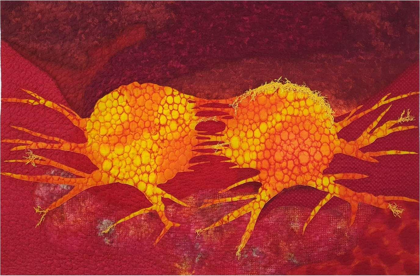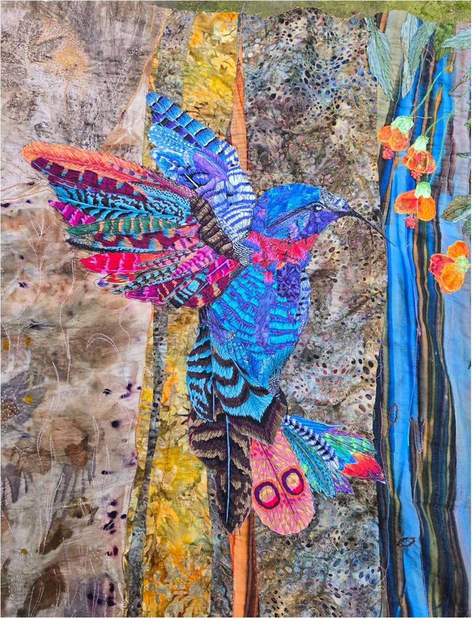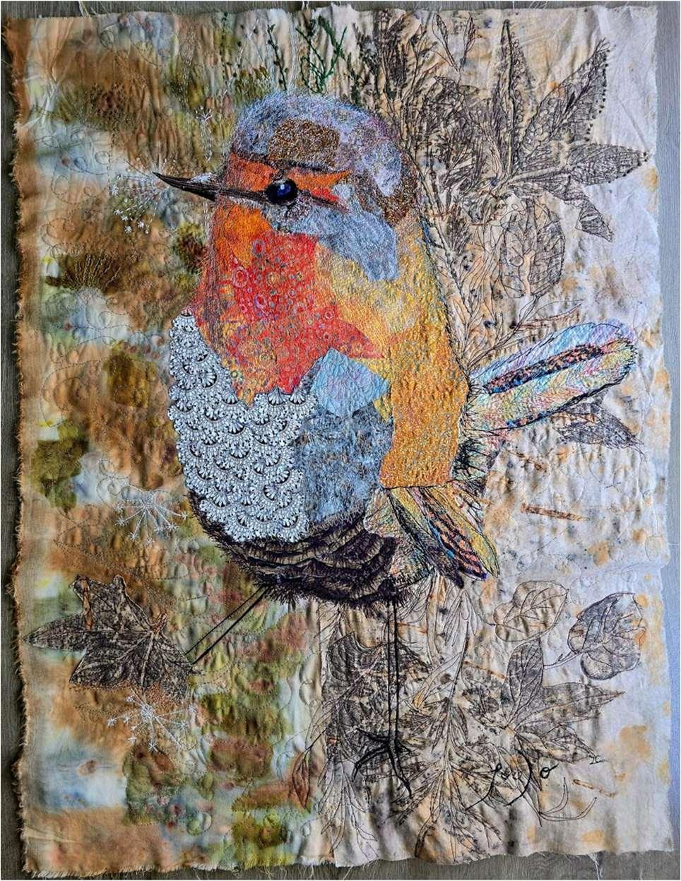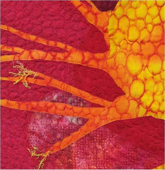 Hand-dyeing,painting,collage,freemotion embroideryandquilting,fusedrawedgeapplique.