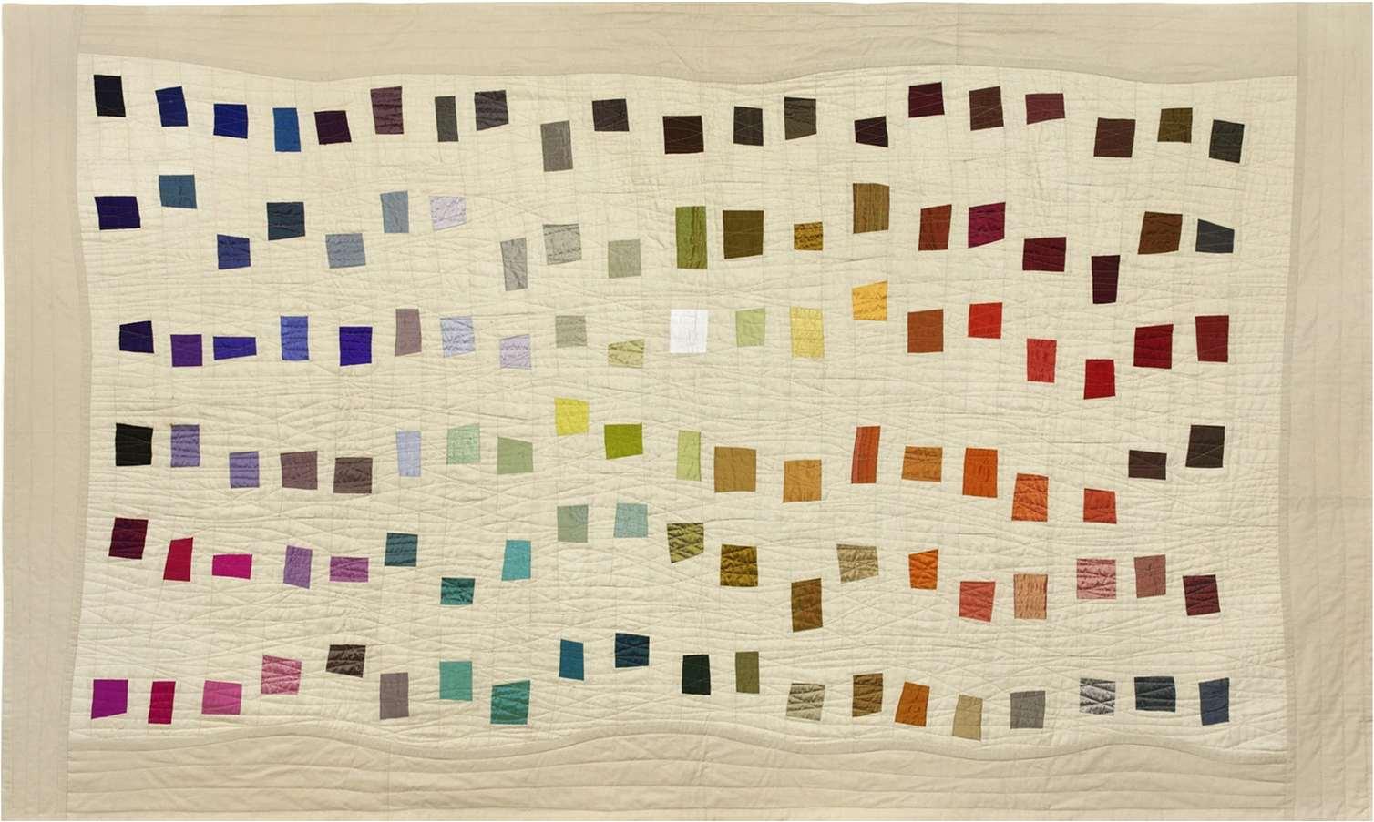 Whatbeganasanexerciseinusingleftoverlinen andsilkscrapsevolvedintoavisualscore.Six undulatingrowsofcolorfragmentscreaterhythm anddialogue,wherewhitebecomessilence, listeningamidexpression,contrast,andrestraint.