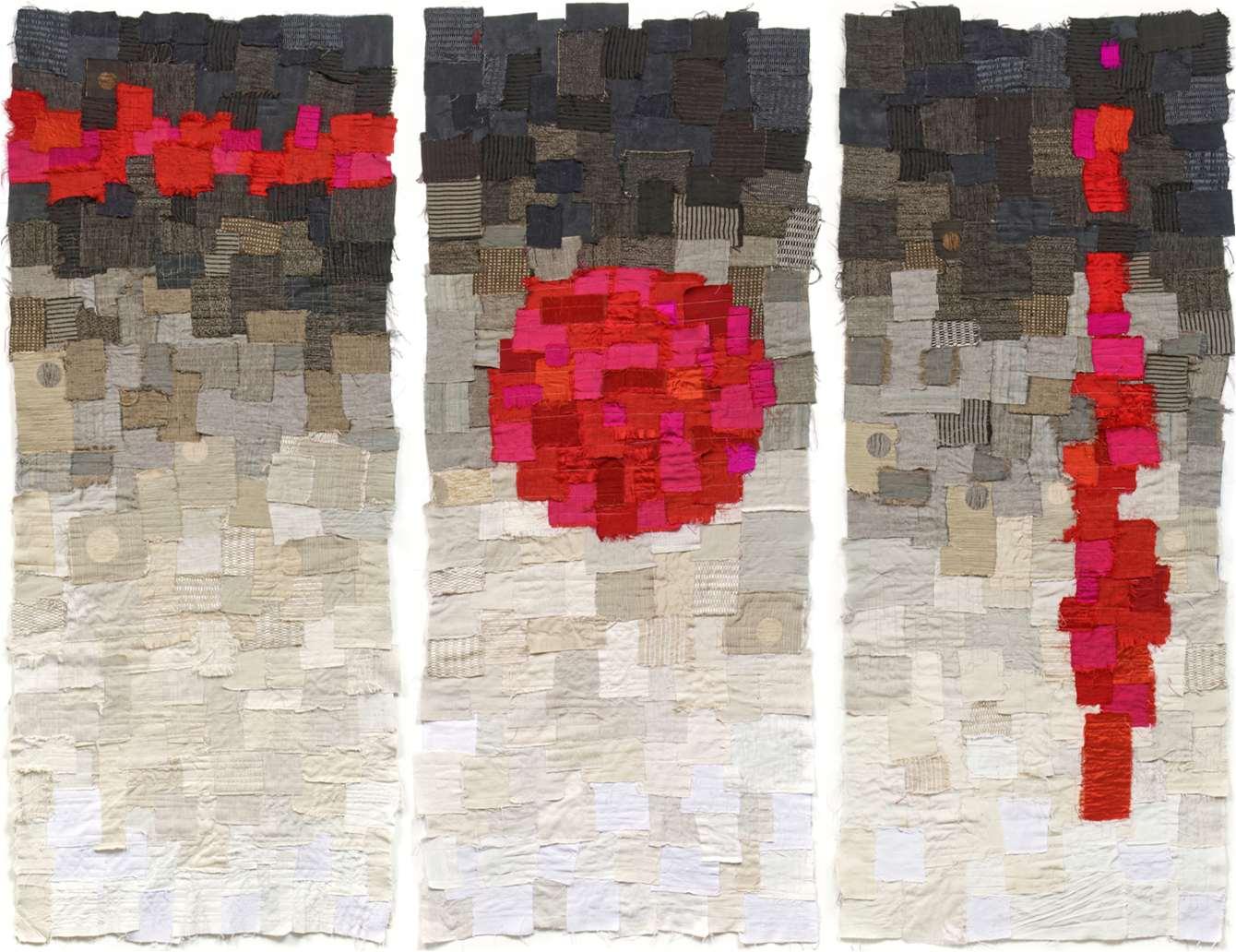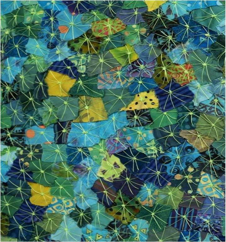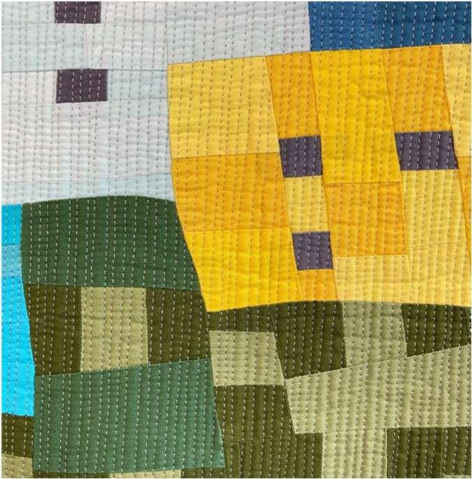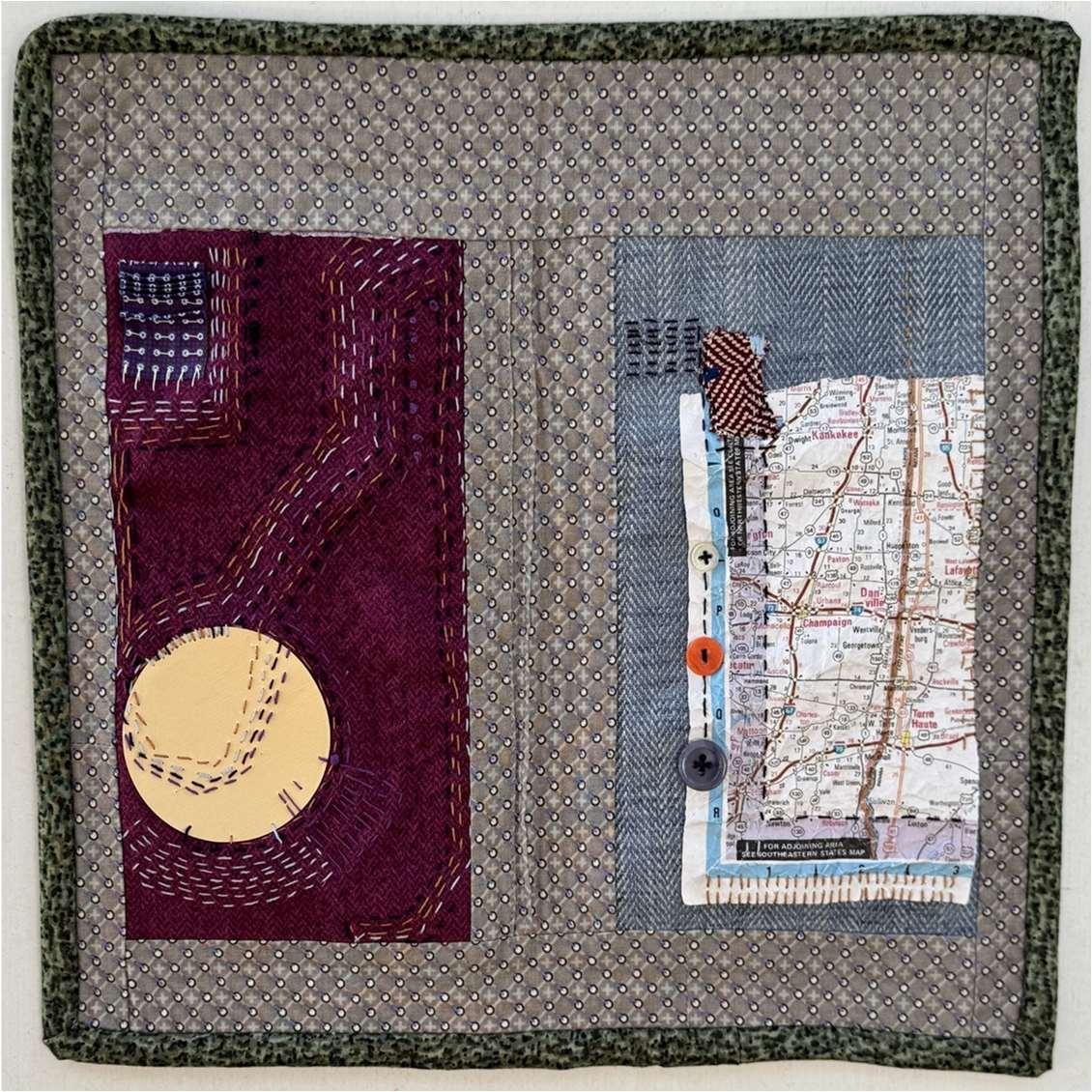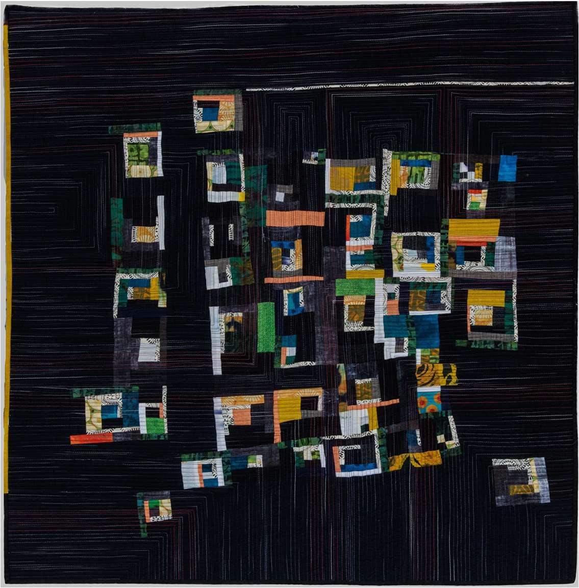 Improvisationalpiecing,collage,paperpiecing, handembroidery,machineandhandquilting.