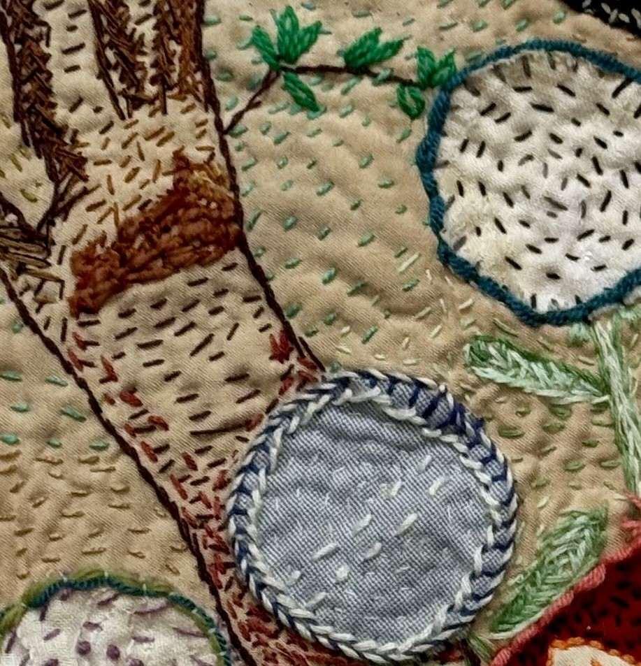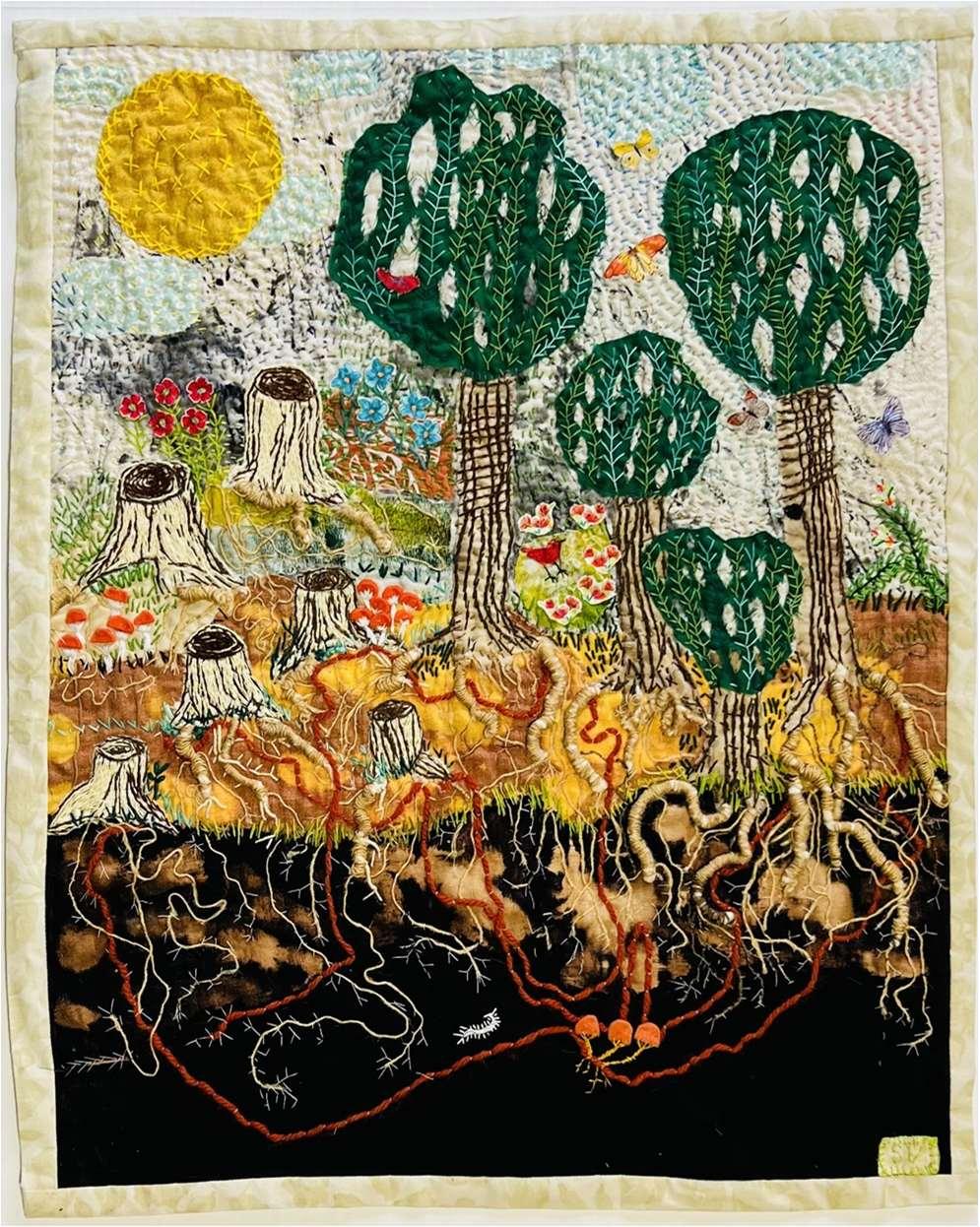ForestsareEarth’slifeblood.Evenpartial deforestationdisruptsecosystems,yetnature endures.Inthisquilt,treestumpsmarkloss,while butterflies,birds,androotssymbolizeresilience, lifepersistingthroughthequiet,interconnected strengthoftheforest.
