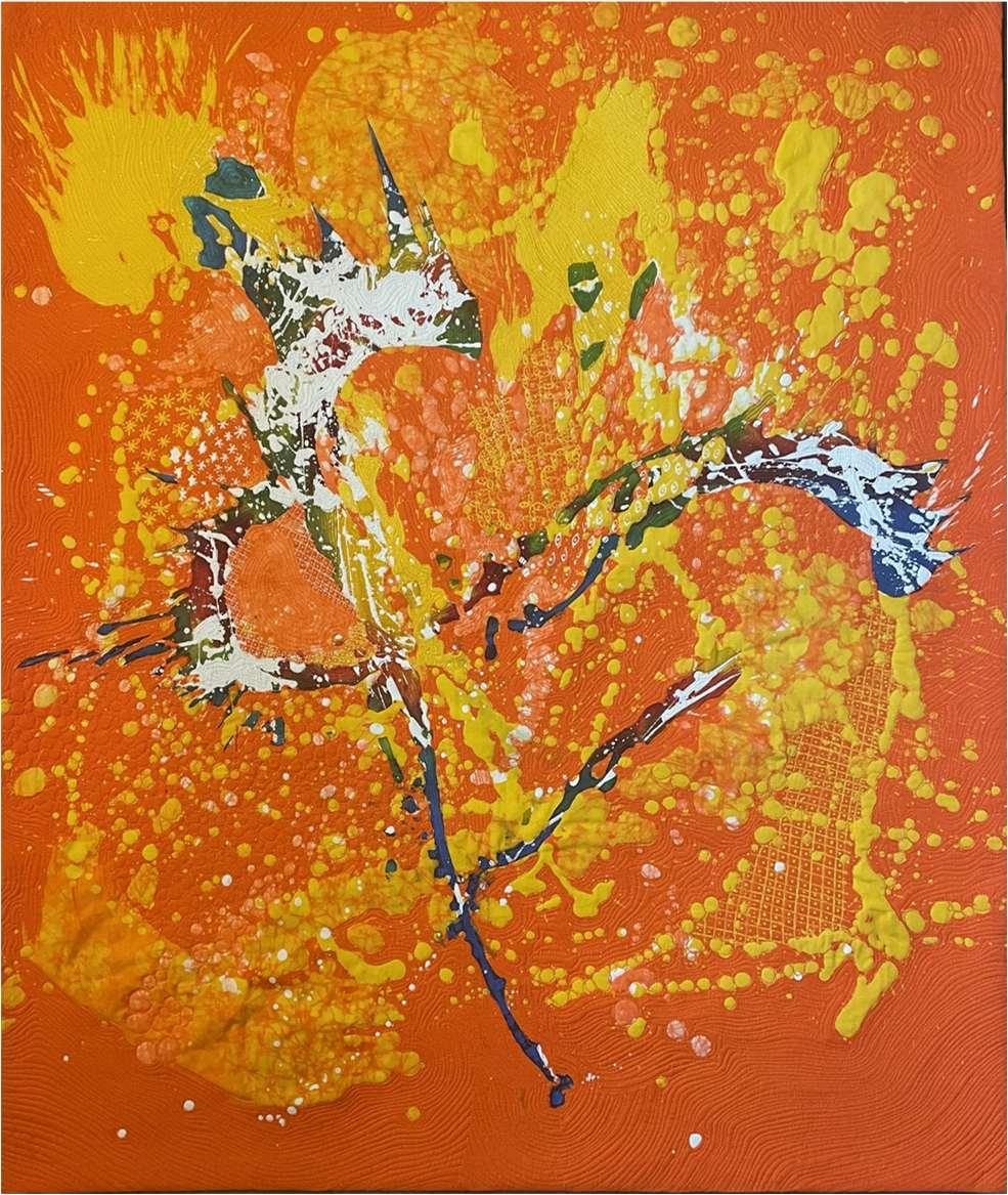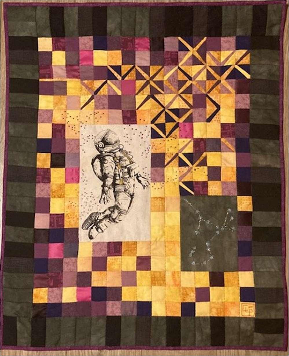 Thisworkspeaksofastimulatinganddynamic balance,createdduringatimeofchange, introspection,andconnectionwithmy surroundings.Hand-stitchingeachfragment throughchallengingdays,Ifocusedonvibrant yellows,magentas,andfadingblacks,starsand constellationsguidingmetowardlight,faith,and creation.
