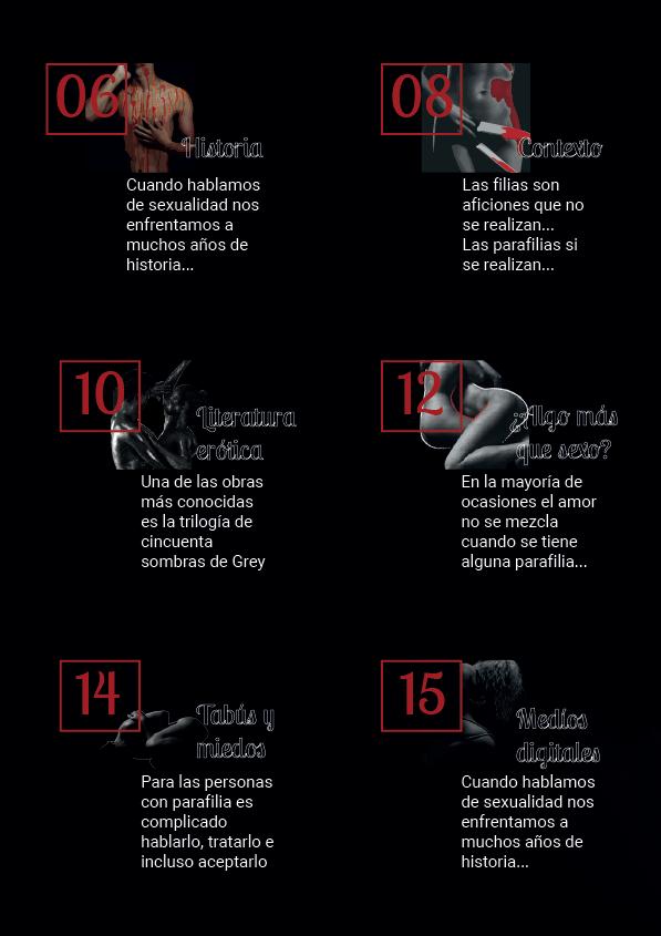 En esta edición de la revista, se explicará sobre las filias, pero nos enfocaremos en las parafilias, que se conoce sobre la historia del sexo y de las parafilias, para conocer y reconocer el contexto de las mismas, encontraremos una reseña de una literatura erótica sobre cincuenta sombras de Grey, la cual es una de las trilogías más exitosas, hablaremos si el sexo se convertirá en algo más o si hay amor por medio, ¿Es posible tener algo más allá que sexo? Como ven las sociedades este tema o su se ve igual en todo lugar y por último contaremos un punto de vista de los medios digitales y la influencia de los mismos en los entornos.