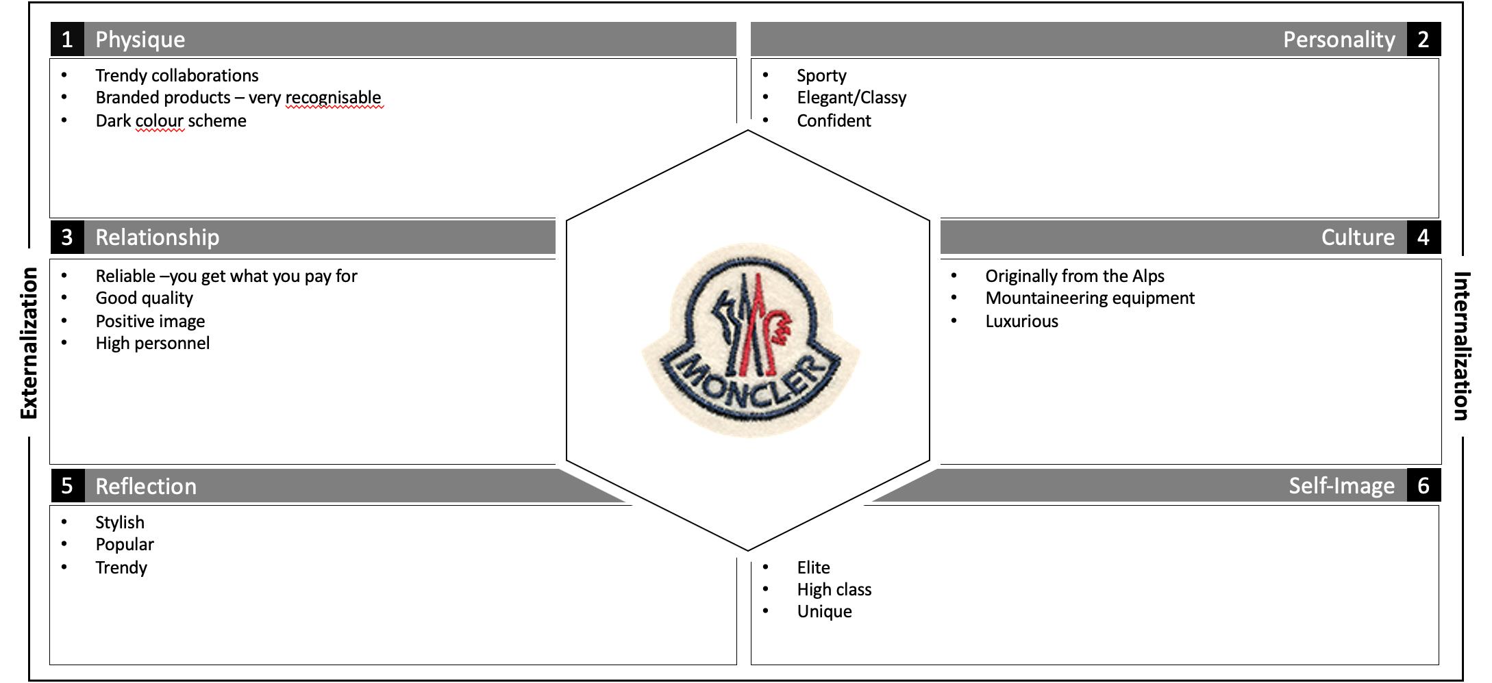 Moncler’s brand identity relies on 5 main principles that are tradition, heritage, friendship, integrity, and innovation (Porto Montenegro, N.D). These principles allow Moncler to be the brand that it is today and resonate with its consumers. The constant high technology and research that is included in its designs and collections transcend beyond the name of the brand and create a trendy and high standing identity for the brand. Furthermore, through primary research, Moncler could be described as having a unique, fashionable and luxurious personality. (see appendix)