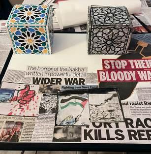 The tiles draw from traditional Middle Eastern patterns, one in monochrome, wrapped n wire representing the trauma and oppression of displacement; the other vibrant and fu l of colour, show ng resi ience identity, and the beauty they ve preserved Both share the same form to reflect cont nu ty and strength The base is a hand painted collage board layered with media and stories grounding the concept in lived experience