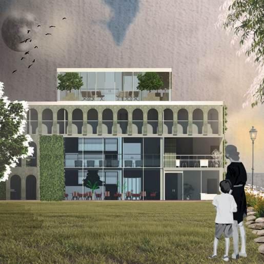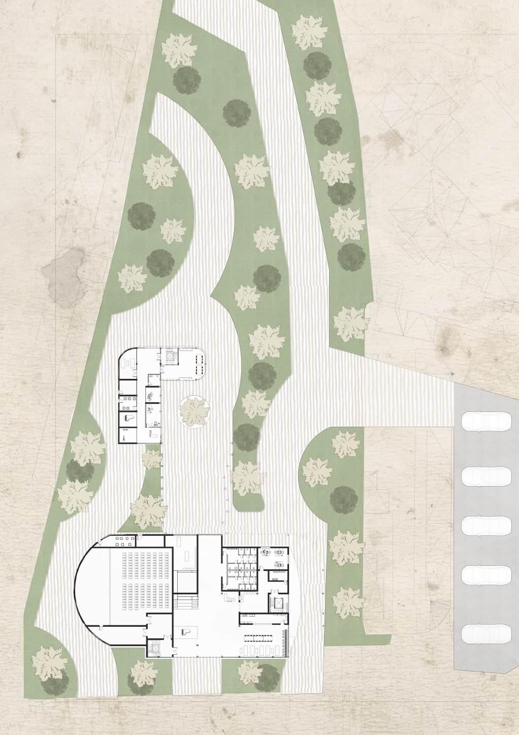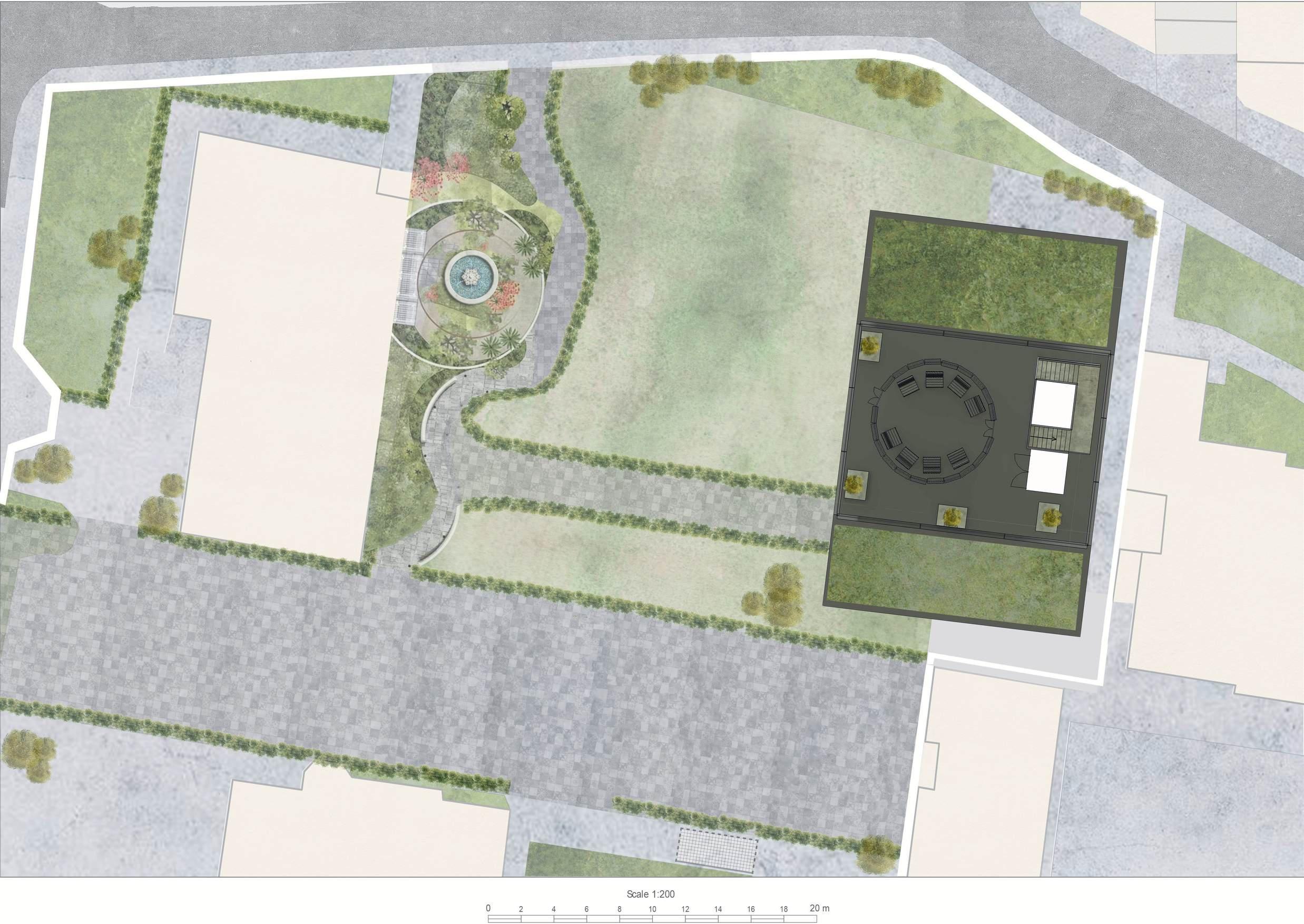 The façade blends openness with privacy using arches and layered greenery to create a sense of cultural familiarity and calm The public courtyard invites gathering, reflection and belonging a safe space in the heart of the city