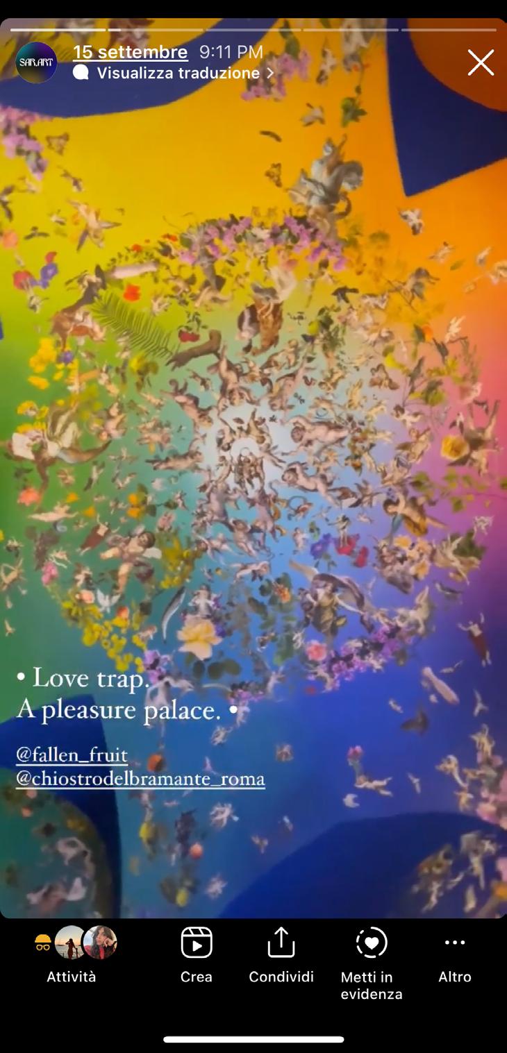 Una volta condiviso il post ho sempre ri pubblicato il contenuto anche nelle storie mettendo la posizione ma dimenticandomi di mettere il tag del luogo, laddove vi fosse il profilo (come per esempio il Chiostro del Bramante a Roma) e anche il tag dell’artista ( nel caso della ricondivisione del post di Jago). Questo permetterebbe al mio profilo di avere più interazioni e di uscire anche nei tag di localizzazione oltre che essere visto da altri profili ed essere ricondiviso. Que sto in effetti mi è capitato con un gruppo di artisti, i Fallen Fruit che hanno ricondiviso