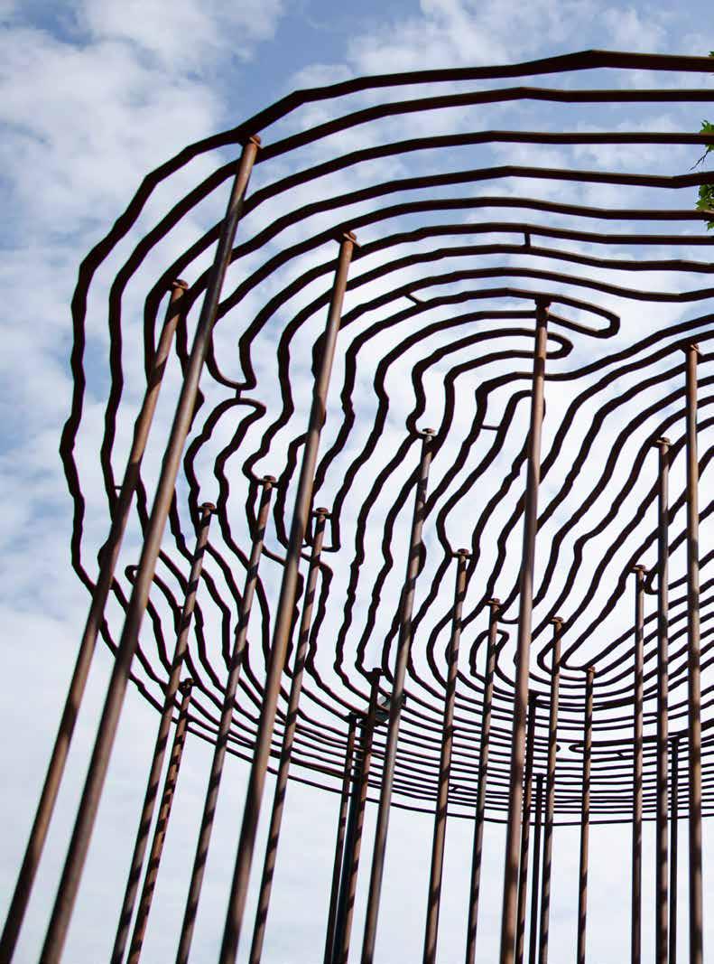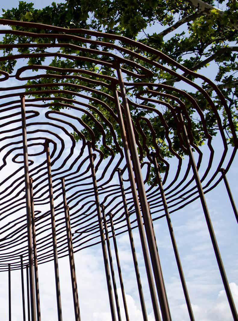 HAVEN, opera vincitrice del concorso “ARCHI’NATURE 2022 – Accanto al mio Albero” realizzata interamente con ferro di recupero del lago d’Iseo, raffigura una grande impronta digitale umana sostenuta da una selva di steli che la elevano all’altezza delle chiome degli alberi tra cui è collocata.