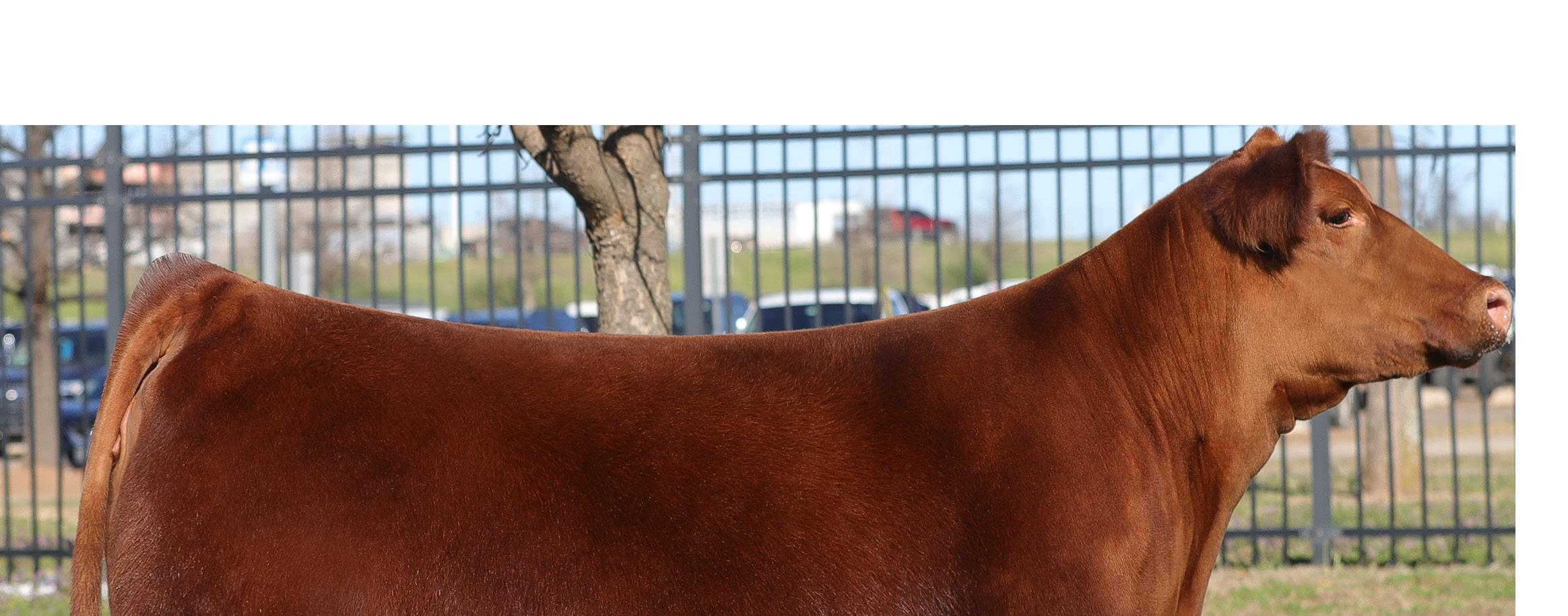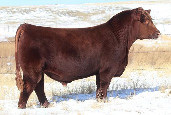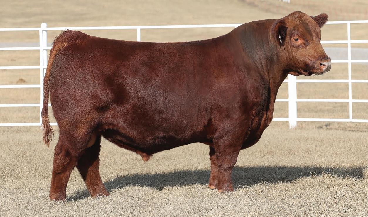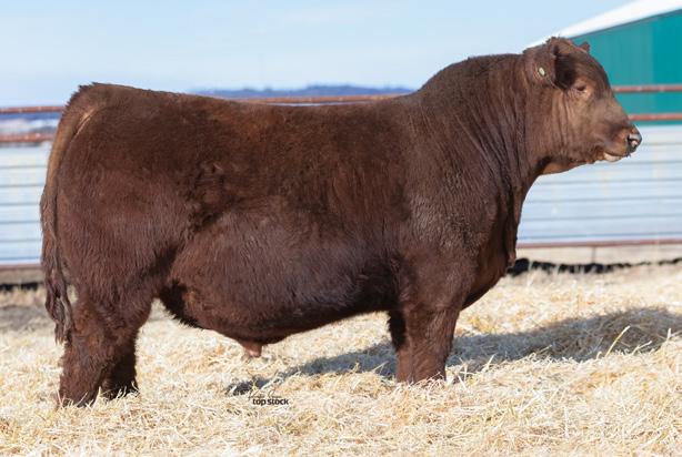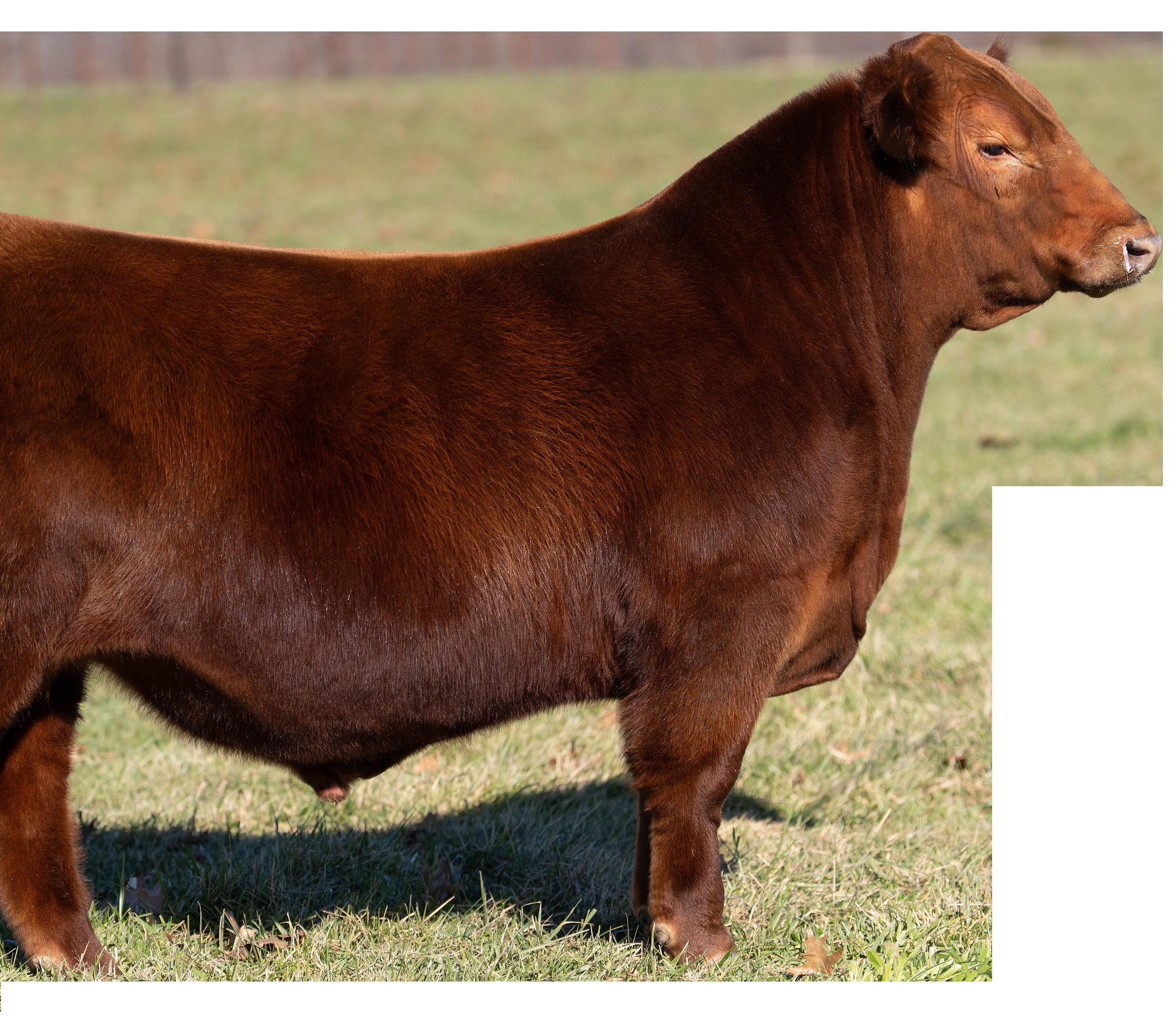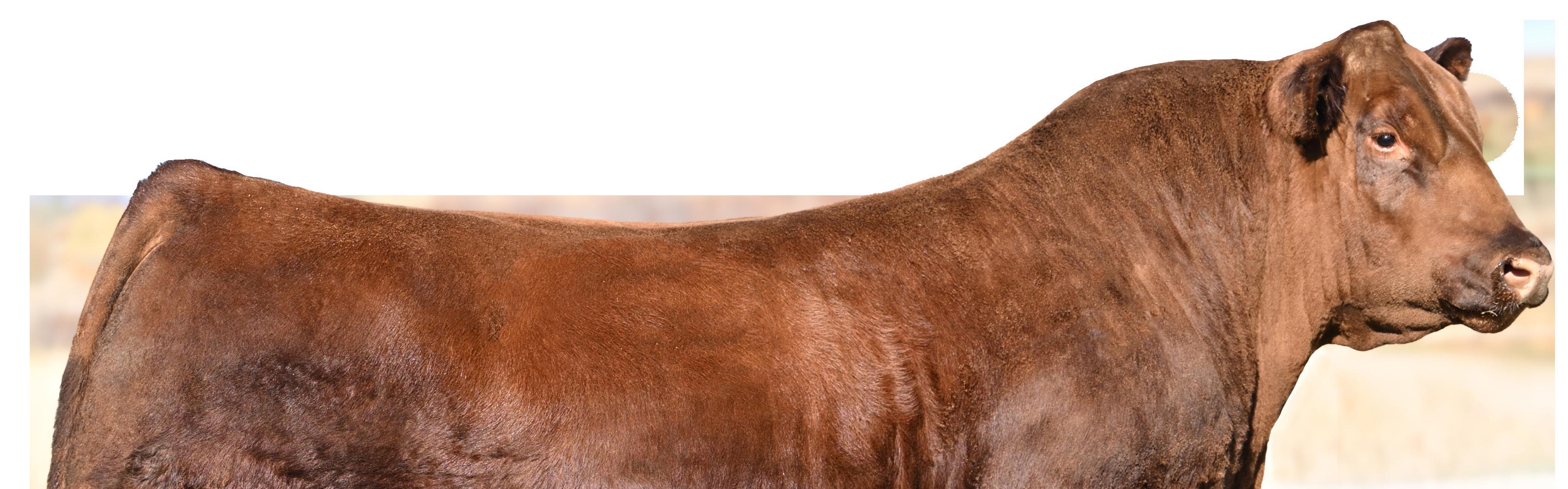 A TRUE POWERHOUSE, ONE THAT IMMEDIATELY CATCHES YOUR ATTENTION AT FIRST GLANCE! THE OVERALL DIMENSION, BOLD SPRING OF RIB, AND A MASSIVE TOPLINE THAT RUNS DEEP INTO HIS LOWER STIFLE. VITTORIO IS A LEGIT OUTLIER, CARRYING A -2.4 FOR BW, A +91 FOR WW, AND A +141 FOR YEARLING GROWTH! WE THINK HE IS JUST GETTING WARMED UP FOR WHAT HE CAN ACTUALLY CONTRIBUTE TO THE RED ANGUS BREED. IF YOU WANT TO MAKE AN IMPACT, VITTORIO IS THE KEY INGREDIENT YOU HAVE BEEN LOOKING FOR! VAST OPPORTUNITIES FOR SEMEN SALES AND FOR PRODUCING POWER BEEF BULLS AND FRONT PASTURE REPLACEMENTS.