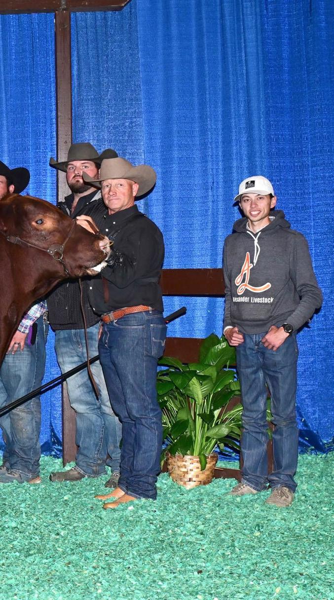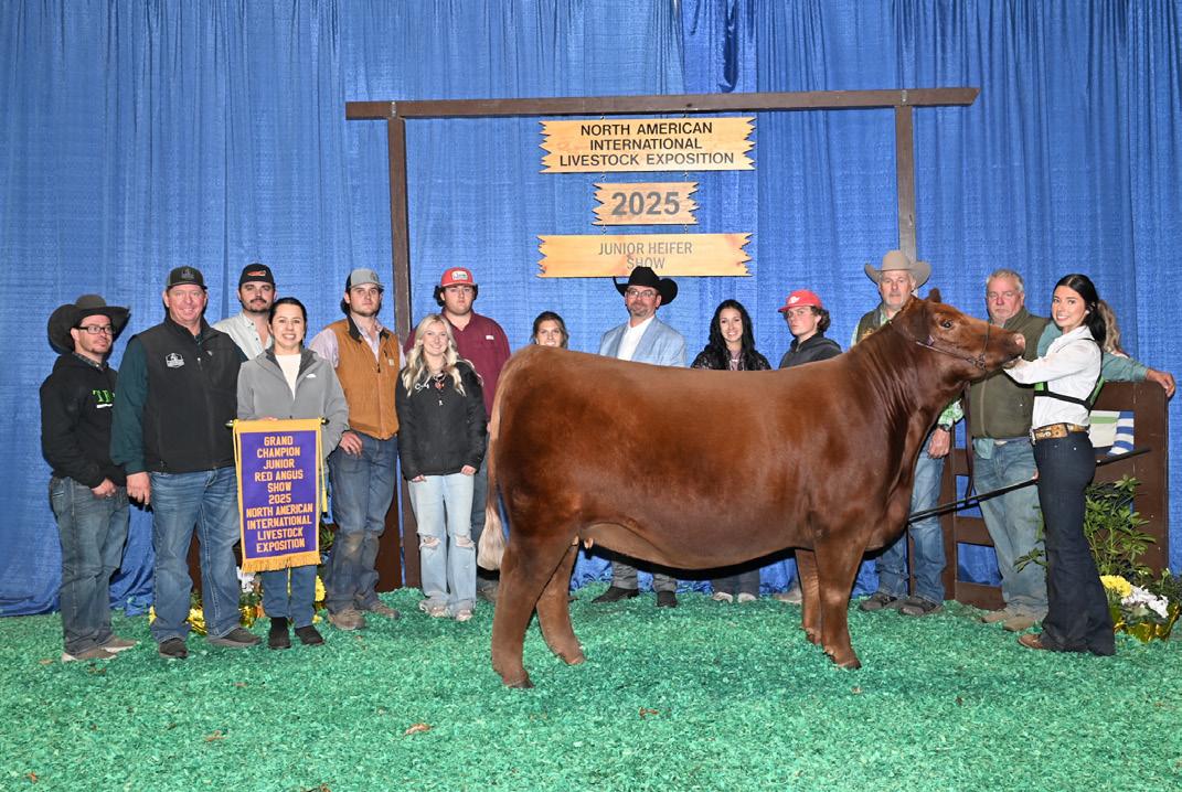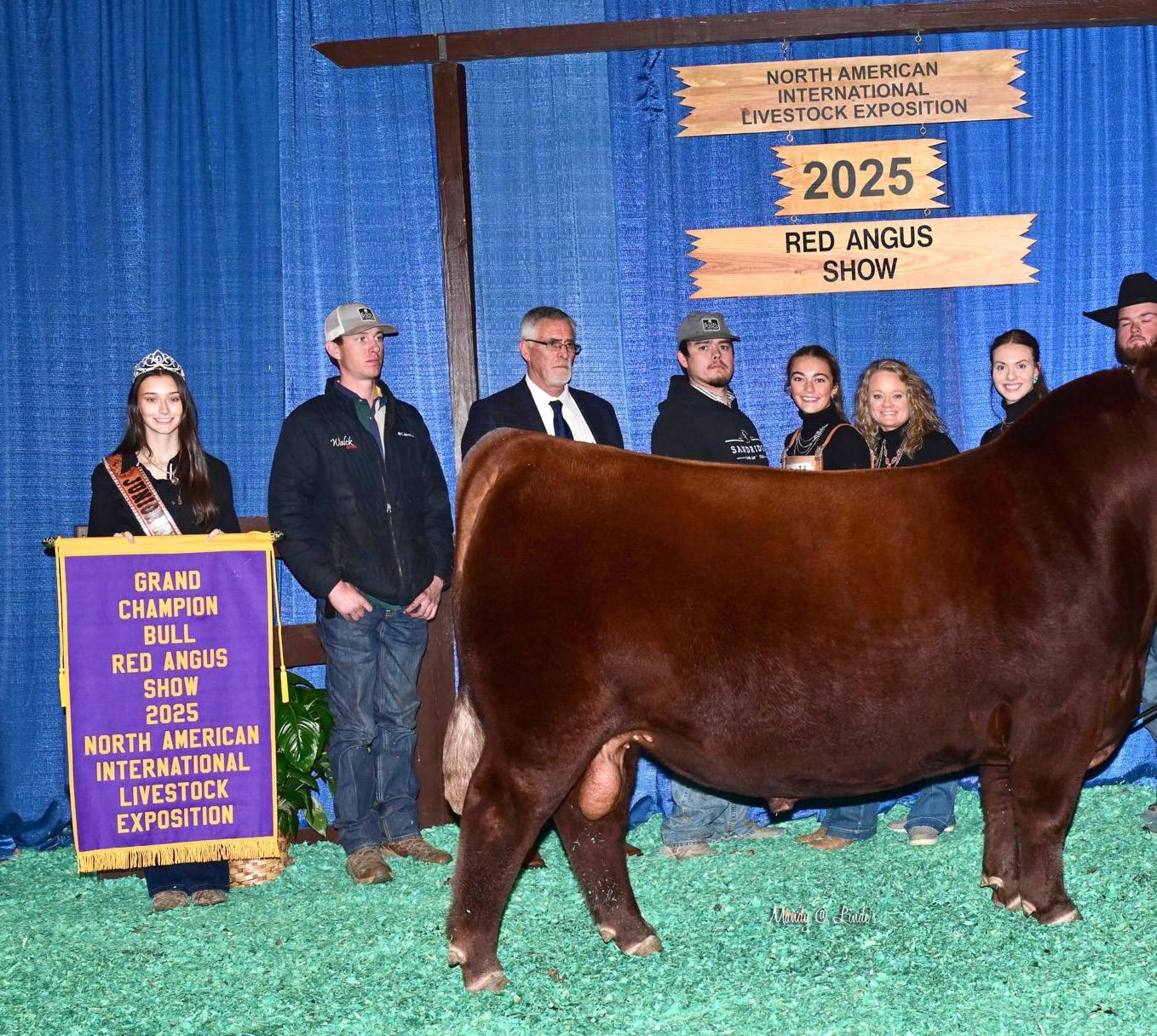 COSMIC COWBOY IS A DREAM COME TRUE FOR US AT SANDRIDGE LAND AND CATTLE! HE HAS BEEN A STAND-OUT SINCE HE WAS A BABY AND HAS NEVER LET OFF THE GAS. HIS WINNINGS INCLUDE RESERVE DIVISION AT 2025 CATTLEMANS CONGRESS, DIVISION CHAMPION 2025 FORT WORTH STOCK SHOW, GRAND CHAMPION BRED AND OWNED AND GRAND CHAMPION PHENOTYPE/GENOTYPE BULL AT 2025 RAYE. RECENTLY HE WAS SELECTED GRAND CHAMPION AT 2025 NAILE. COSMIC BLENDS THE CORRECT AMOUNT OF MUSCLE AND MASCULINITY WITH AN IMPECCABLE RIB SHAPE. HIS MOVEMENT IS FLUID AND SMOOTH AND THE AMOUNT OF PRESENCE HE CARRIES IN HIS NECK SHOULDER JUNCTION WHILE MAINTAINING A CORRECT SHOULDER ANGLE IS JUST ASTOUNDING. GENETICALLY SPEAKING, HIS 100% WESTERN CANADIAN OUTCROSS PEDIGREE OFFERS A SIGNIFICANT VALUE TO THE RED ANGUS BREED. HIS SIRE, RED SSS MOONPIE 680K HAS GARNERED QUITE THE RECOGNITION AND WILL CONTINUE TO DO SO AS MORE OF HIS PROGENY ARE