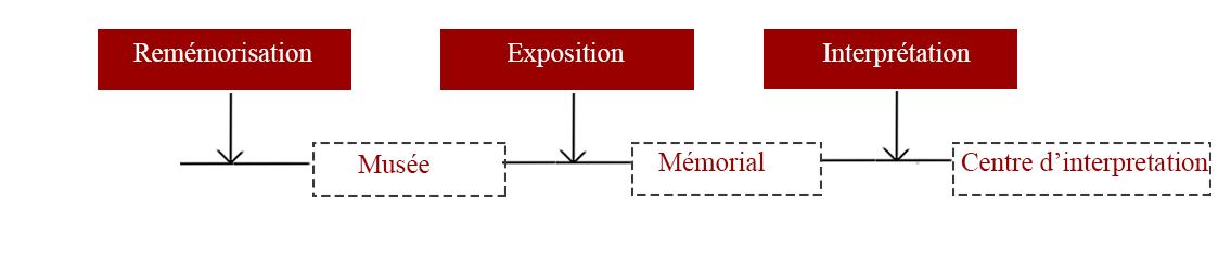 Parmi ces constructions ont peut citer les musées,les mémorials et les centres d’interprétation. Ces derniers soulèvent de nombreuses questions surtout par rapport à leur désignation, leur différence, leur similitude et leur aptitude à raviver la mémoire. On les retrouve à la fois indépendantes et associées par exemple sous forme de musée mémorial, de centre commémoratif ou de centre d’interprétation muséographique. Bien qu’elles soient différenciées au niveau de leur nomination, elles se chevauchent parfois dans la mesure où chacune d’entre elle renferme implicitement les spécificités de l’autre. Leurs finalités ne sont pas tout à fait superposables, mais ces constructions ont un but en commun qui est la transmission et la sauvegarde de l’histoire et une limite partagée qui est la dénaturation de cette dernière.