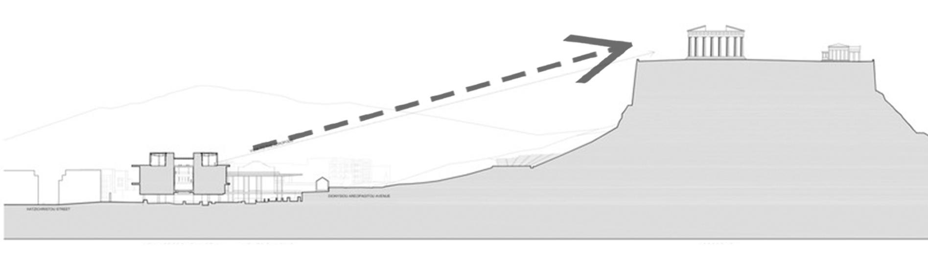 Dans le musée de l’acropole d’Athènes, la collection est loin d’être destructive de la mémoire car l’architecte a prévu une mise en scène bien étudiée. Il a essayé de garder le contact visuel avec le site archéologique. Pour éveiller le souvenir de l’acropole, l’architecte profite du fait que le musée soit implanté à 300m de ce dernier et le contact entre l’homme et la ruine est assuré par le biais de l’architecture qui établit elle-même un contact visuel et matériel avec l’archéologie.