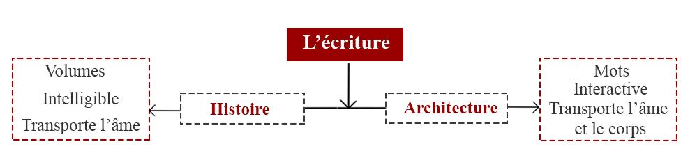 Les deux écritures sont importantes et indispensables à l’art de mémoire et d’ailleurs elles sont étroitement liées. On ne peut parler de l’une sans aborder l’autre. L’architecture est à la fois porteuse et génératrice, support et réceptacle, contenant et contenu de l’histoire. Le lieu architectural est le support de création de toute histoire. Comme elle est inscrite dans un cadre temporel, l’histoire est enracinée dans un cadre spatial où nécessairement l’architecture était présente et c’est à elle de nous renvoyer vers le souvenir dont elle a été témoin. Ruskin affirme que « nous pouvons vivre sans architecture, adorer notre dieu sans elle, mais sans elle nous ne pouvons-nous souvenir. »25.