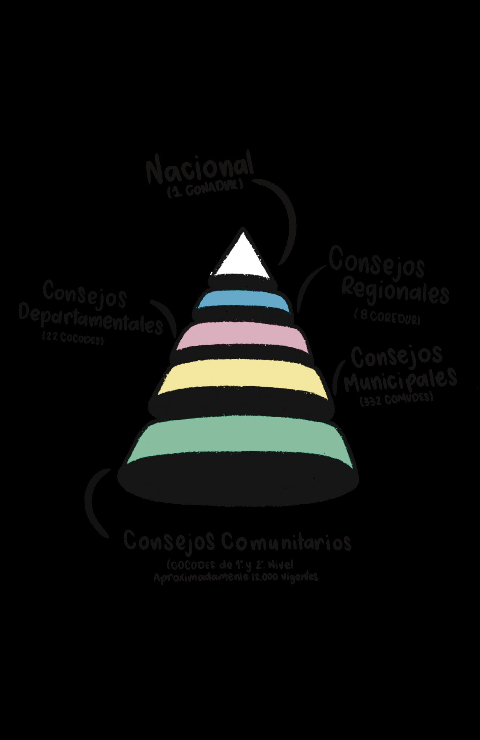 • En la pirámide puedes ver como las demandas de la población pueden subir desde el consejo comunitario (COCODE) hasta el consejo nacional (CONADUR) y de la misma forma desde este se diseñan planes nacionales que bajan hasta volverse ejecutables en lo local, gracias a la coordinación de cada consejo de desarrollo.
