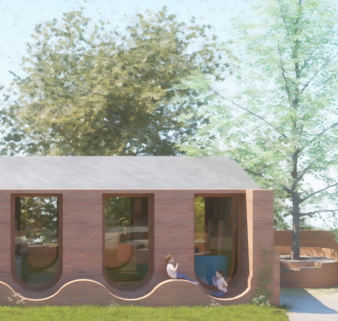 The coworking space allows for freeform office working for parents who are struggling with childcare creating an environment where the space outside is overlooked by parents while they work.