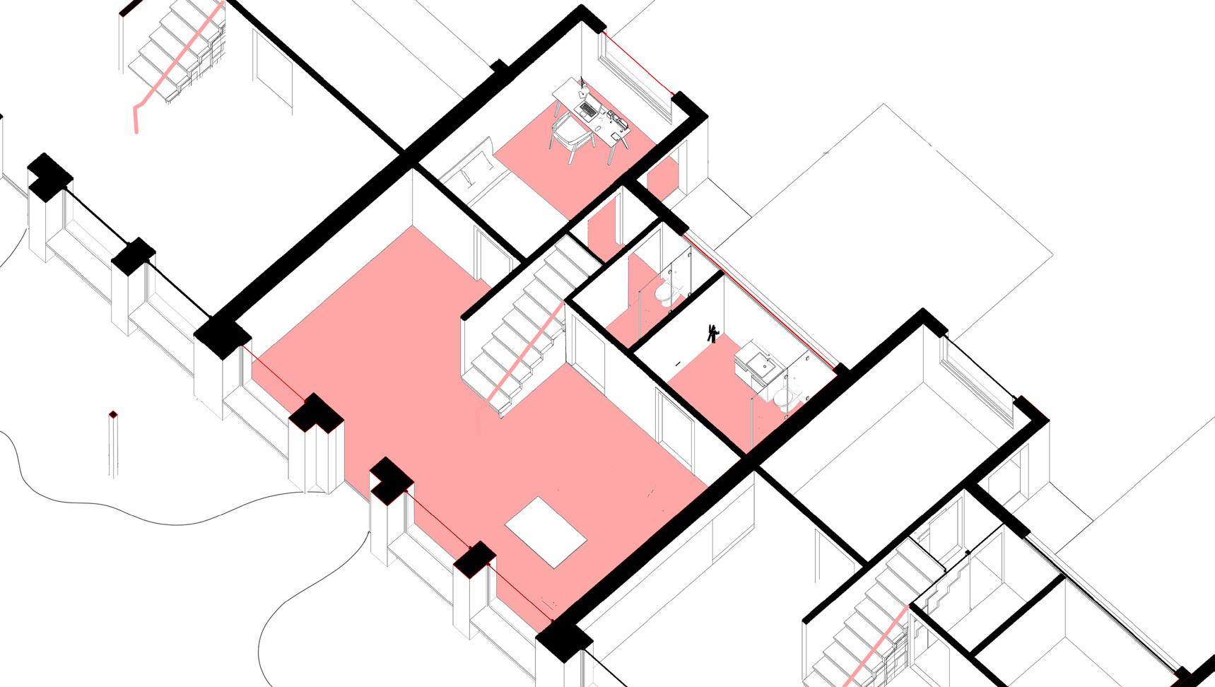 Use of site Isolationism- recessed pathway around the island.