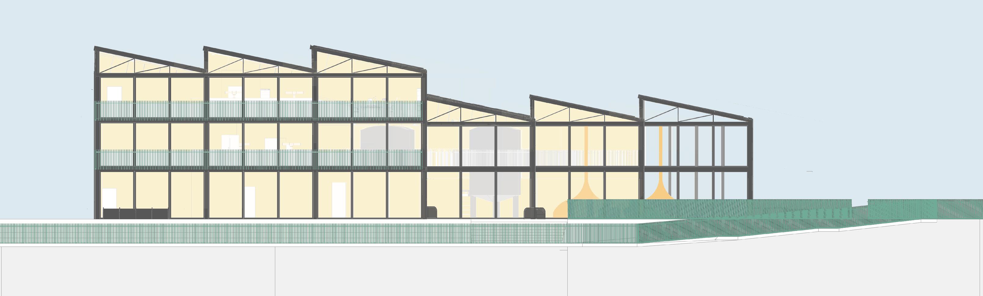 The pathway through is elevated and allows the factory processes beow to have flexible space and adjust the space to their needs as demand rises and falls.