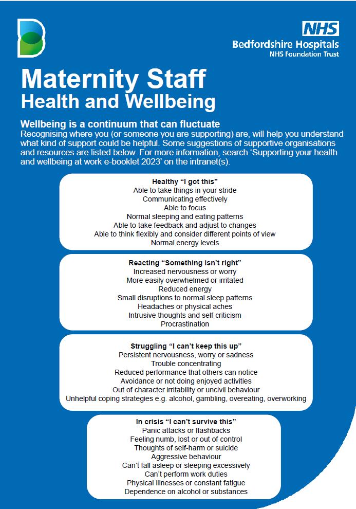 2. Bedfordshire Human Resources & Maternity Unit (2022) Maternity Staff Health and Wellbeing Poster. Bedfordshire: Bedfordshire Hospitals NHS Foundation Trust.