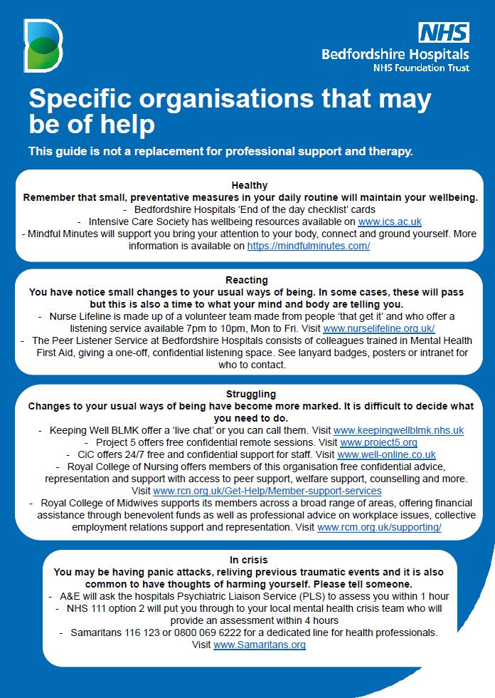 3. Chater, R. & Spong, A. (2020) Maternity Staff Health and Wellbeing Leaflet. Adapted May 2023 by the Communications Team. Bedfordshire Hospitals NHS Foundation Trust: Bedfordshire.