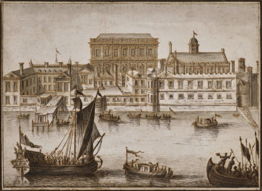 The present drawing is based on a print from 1707 by Pieter van der Aa (1659-1733) which depicts the palace from the Thames. It captures from left to right, the King’s or Volary Lodgings (built between 1666-8), the Privy Bridge extending into the River (begun under Wolsey, rebuilt under Henry VIII and remodelled between 1576-8). The Queen’s Lodgings (1666-8), sit next to the river and in front of the Banqueting House (built by Inigo Jones between 1619-22) and to the right lie the Privy Kitchen range with lodgings above (begun under Cardinal Wolsey). Just behind this is the Chapel Royal and with one of the towers of the Holbein Gate (built 1531-2) visible just behind. The Whitehall Stairs, the public landing place, is visible to the far right.
