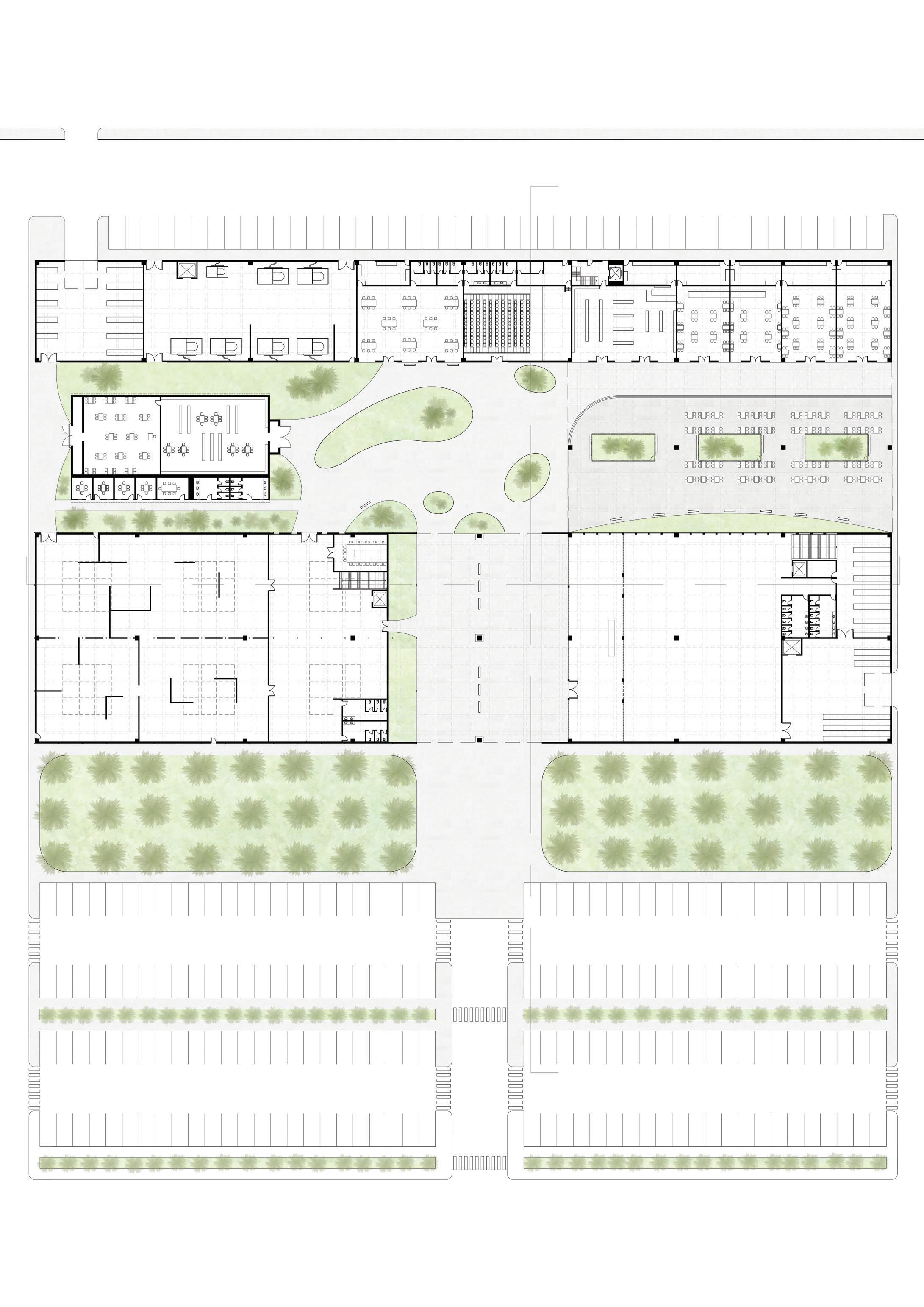 The aim of this project is to create a space where people can gather and come together through integrating different functions and a lively outdoor space, which is why it is called ‘AlJadad’ - meaning the gathering of dates when harvesting in Arabic, whilst also conserving the spirit of the old date factory through the industrial look of the buildings.