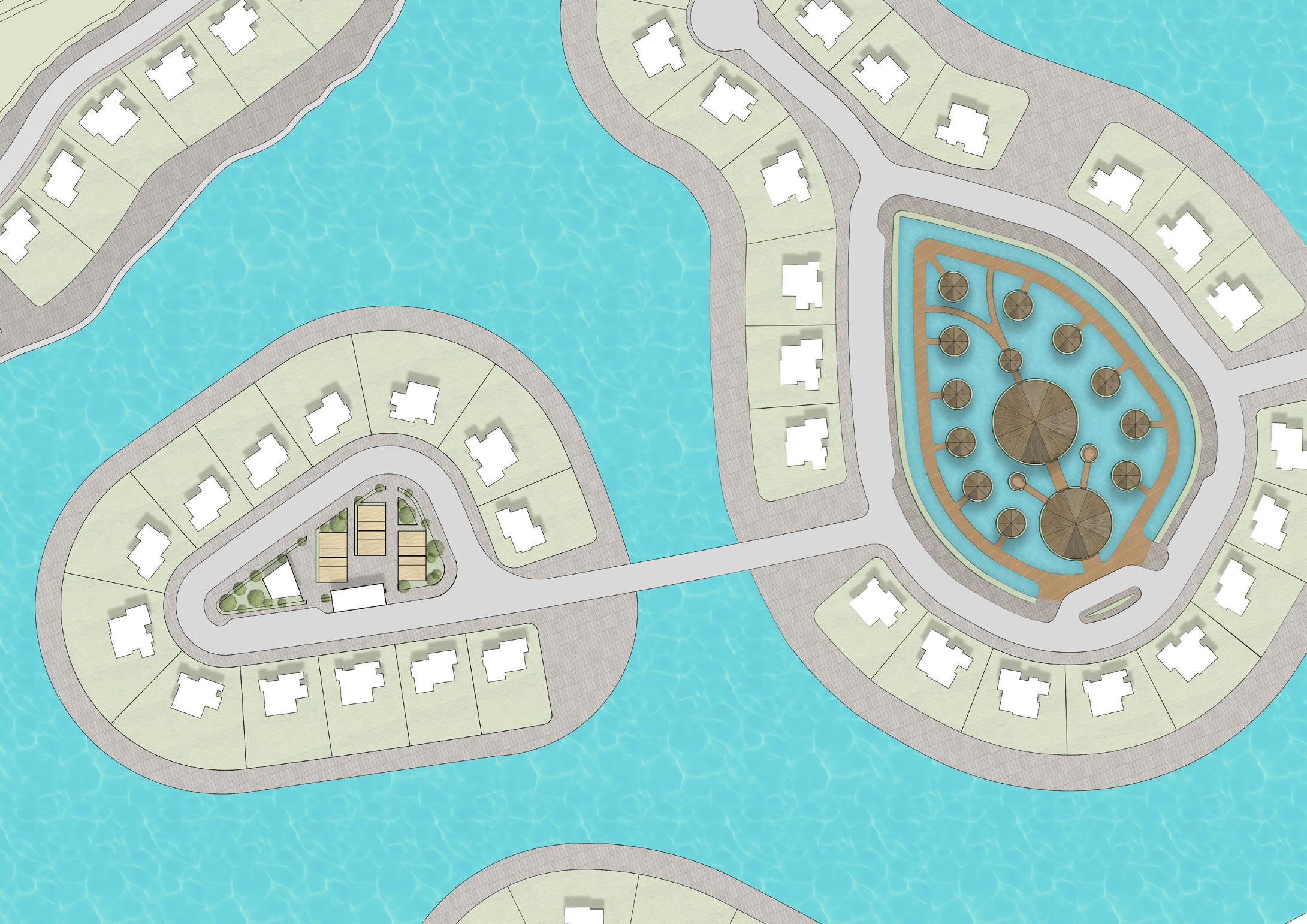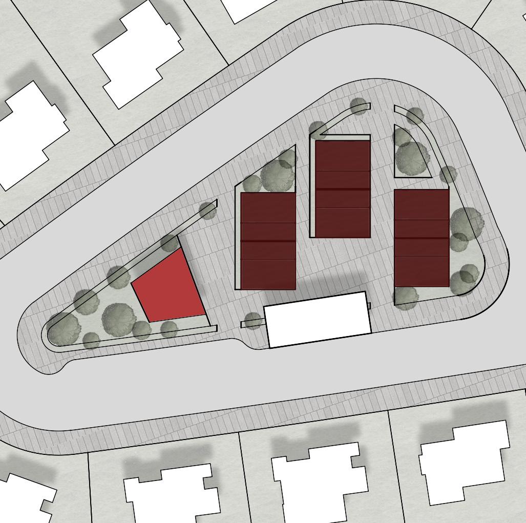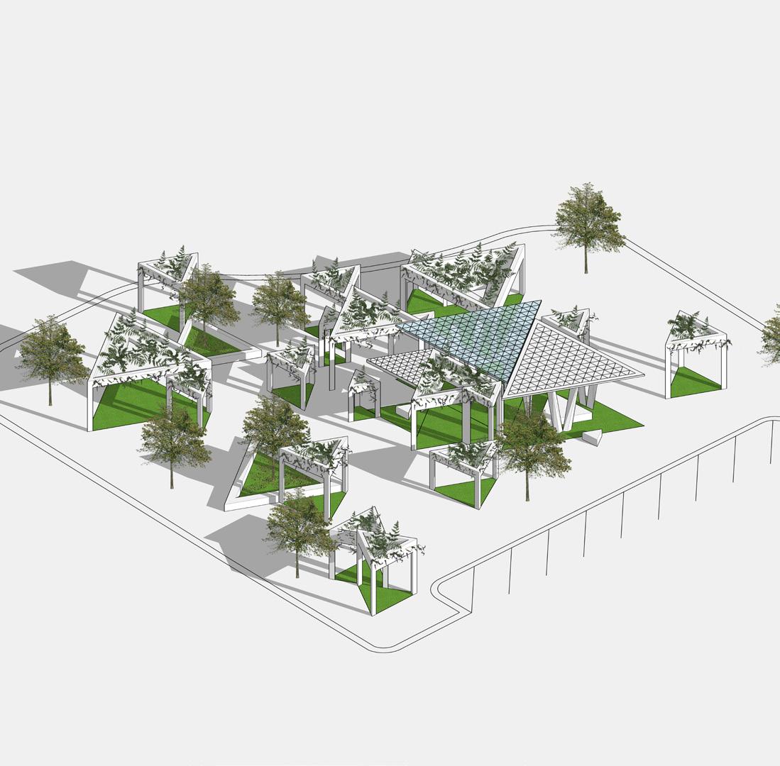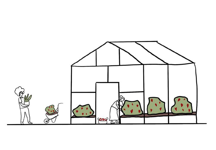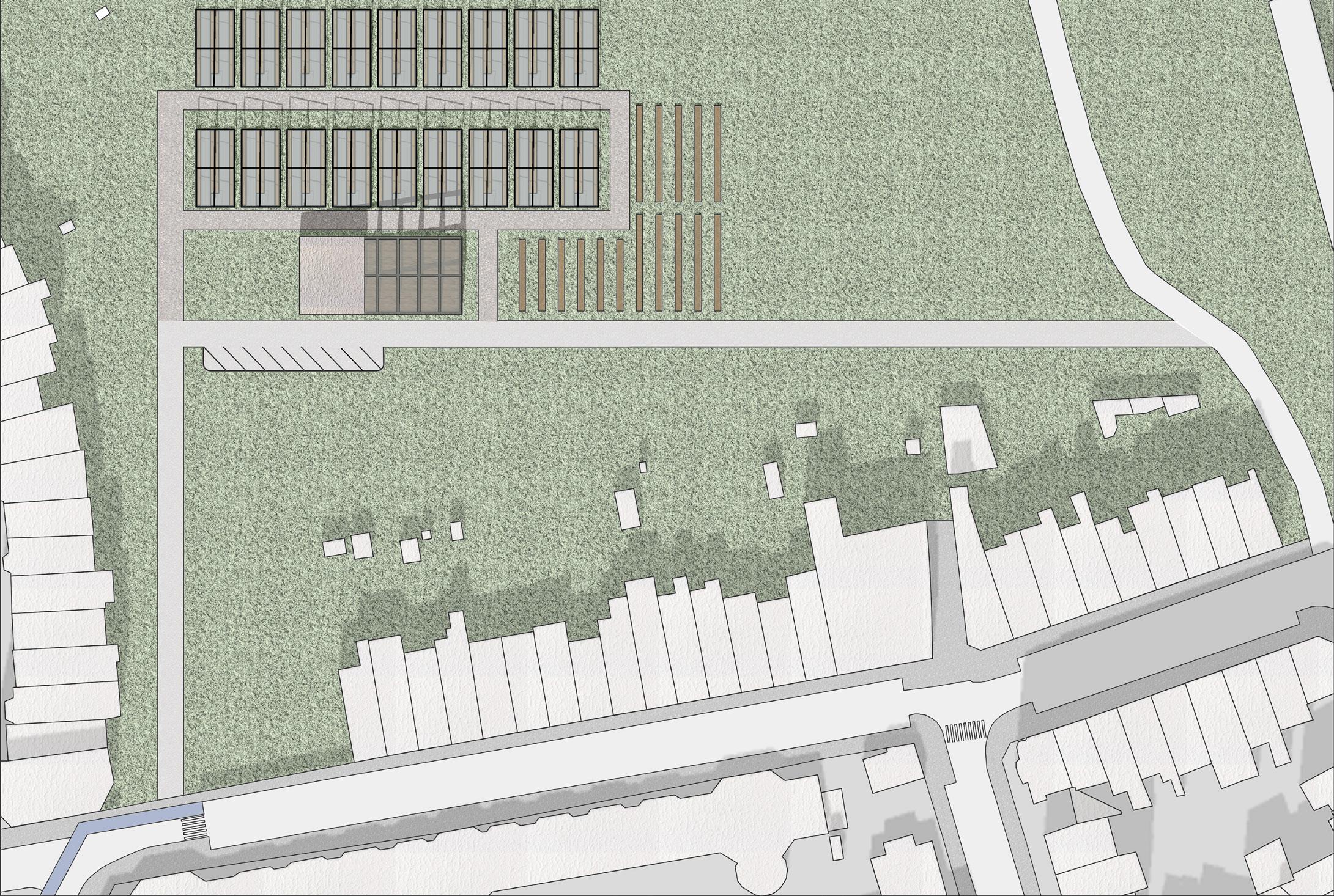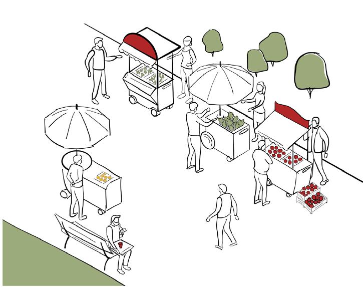The main idea for the program in Urban Gardens is to introduce the concept of rental gardens and greenhouses (1 & 2). The gardening community can then commute, using bike lanes, and sell their harvests at the weekly market in the square (3).