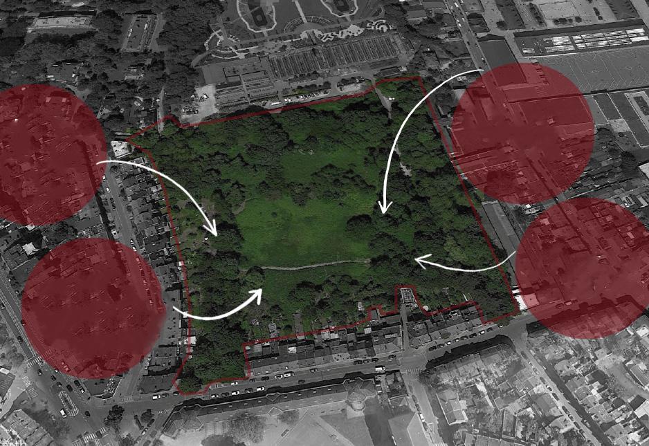 We identified three underutilized spaces: an abandoned park, Donderberg, once part of the royal gardens and untouched for over 50 years, featuring rich soil; a plaza near the train station, used now mainly for parking; and Annie Cordy Park, located next to the main church and royal graveyard, now surrounded by roads and car infrastructure.