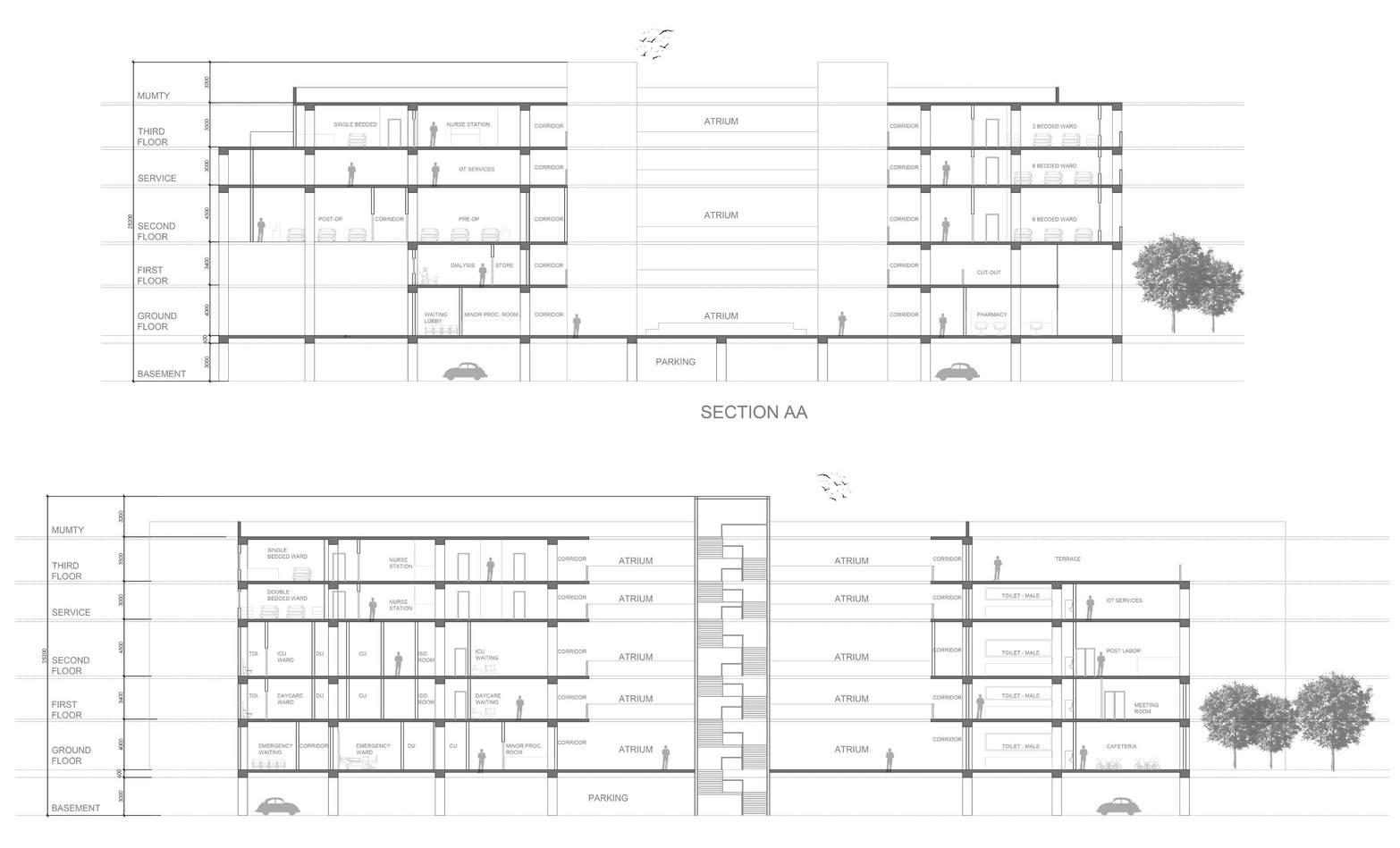 The building is divided into the 3 zones vertically. The ground and first floor provide daily out patient services and form the OP department. The second floor consists of operation theatres, ICUs, HDUs and other critical care units that make up the semi-public zone. The third floor comprise of all the in patient beds and form the IP department, making it the private zone, accessible only by patients and their caregivers. The OT floor is separated from IPD by a partial service floor, which houses the services and additional IP beds.