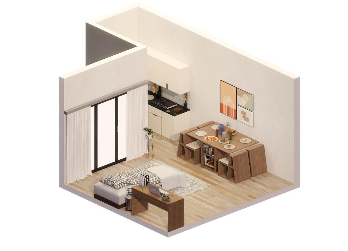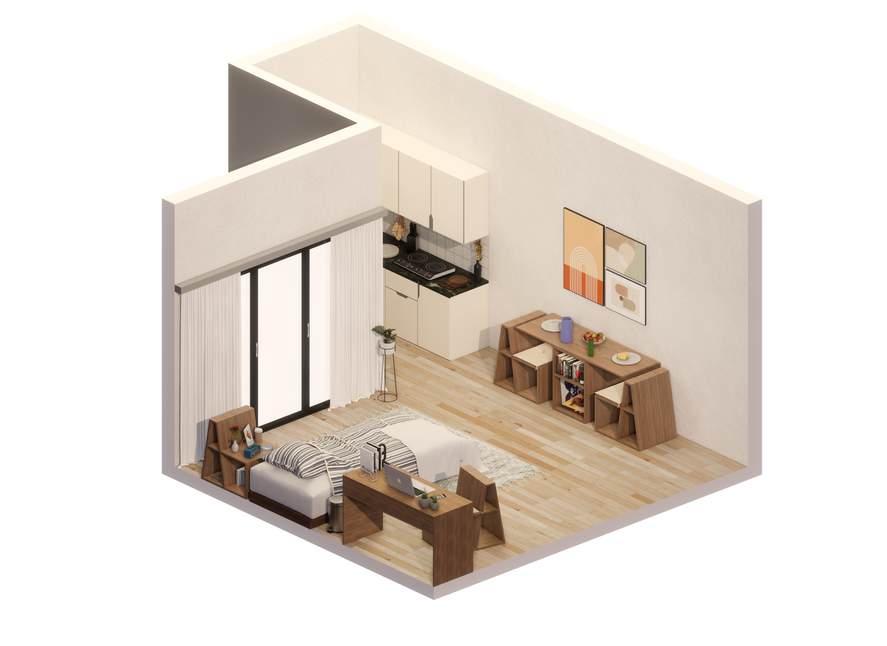 DELF combines storage, seating, and dining in one compact piece. Its versatility allows users to adapt it to different needs throughout the day. The two primary configurations include: A 2- or 4-seater dining table. - Extra chairs that can function as nightstands, shelves, or be stacked away for more storage space.