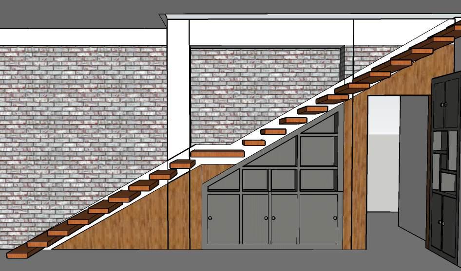 The walls of the elevation are cladded with stone to compliment the wood staircase and wood panelling under the stairs.