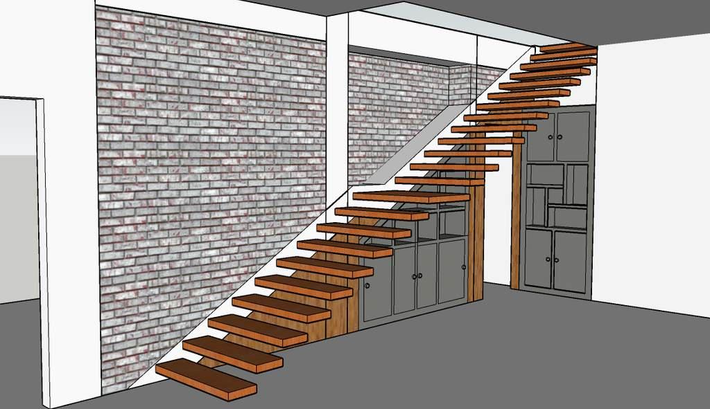 The staircase designed consists of wooden planks that are connected using a reinforced concrete stringer that is flushed with the adjacent wall.